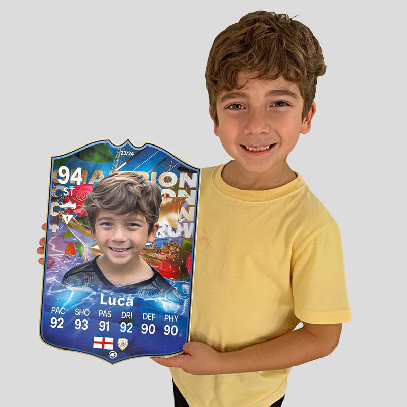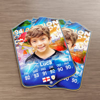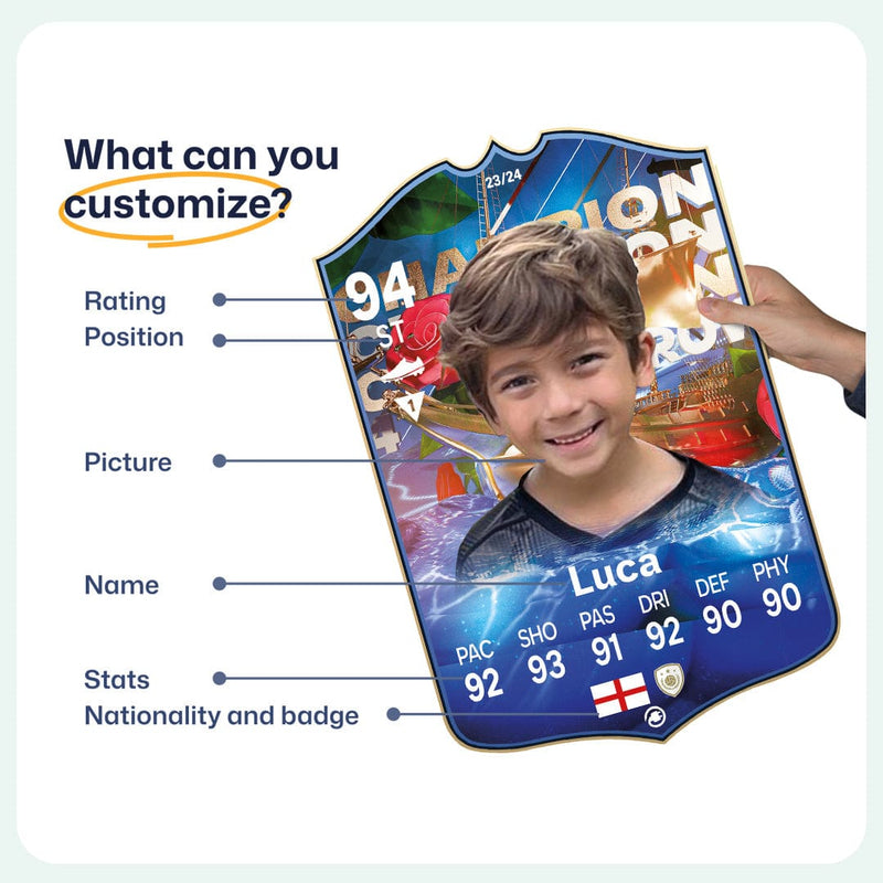 When it comes to personalising your card, the basic steps are to upload a photo and add a name to your card. Then you’ll add details like your player’s position and skill ratings out of 99 for each football skill shown on the card. Our online card builder makes this really easy. And if you aren’t a football card expert, don’t worry!