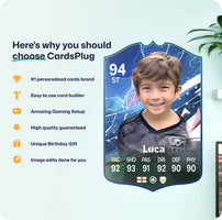 Yes! Our football card designers will remove the background from the photo you upload so it looks just like the football cards you might’ve seen games like EA FC 25, EA FC 24 or FIFA. We’ll also position the photo perfectly on the football card so it looks great. If there are any problems with the quality of your photo, we’ll reach out and let you know. Plus, our website's AI will remove the background on the image for visual purposes before purchase so you can see it without a background on the card.