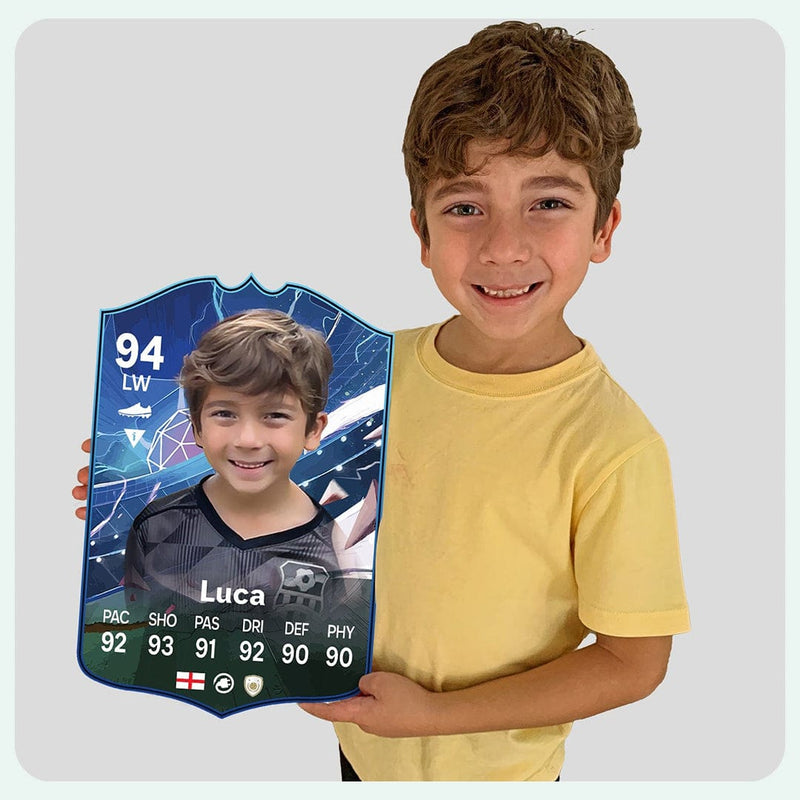 When it comes to personalising your card, the basic steps are to upload a photo and add a name to your card. Then you’ll add details like your player’s position and skill ratings out of 99 for each football skill shown on the card. Our online card builder makes this really easy. And if you aren’t a football card expert, don’t worry!
