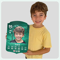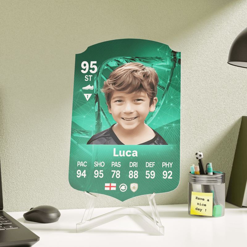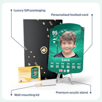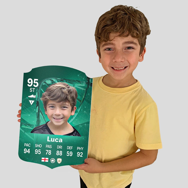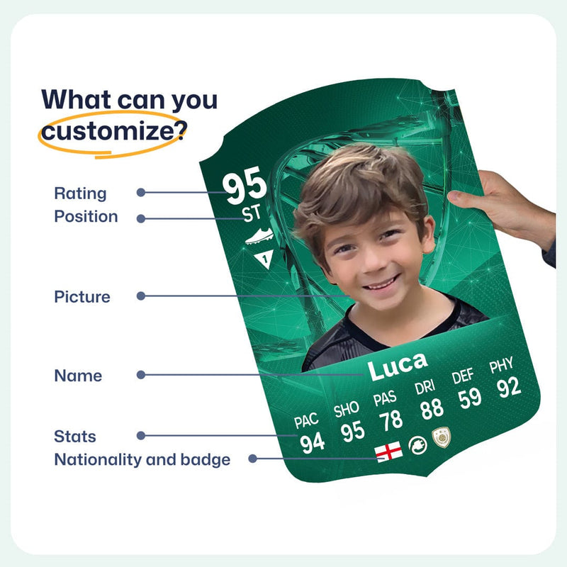 When it comes to personalising your card, the basic steps are to upload a photo and add a name to your card. Then you’ll add details like your player’s position and skill ratings out of 99 for each football skill shown on the card. Our online card builder makes this really easy. And if you aren’t a football card expert, don’t worry!