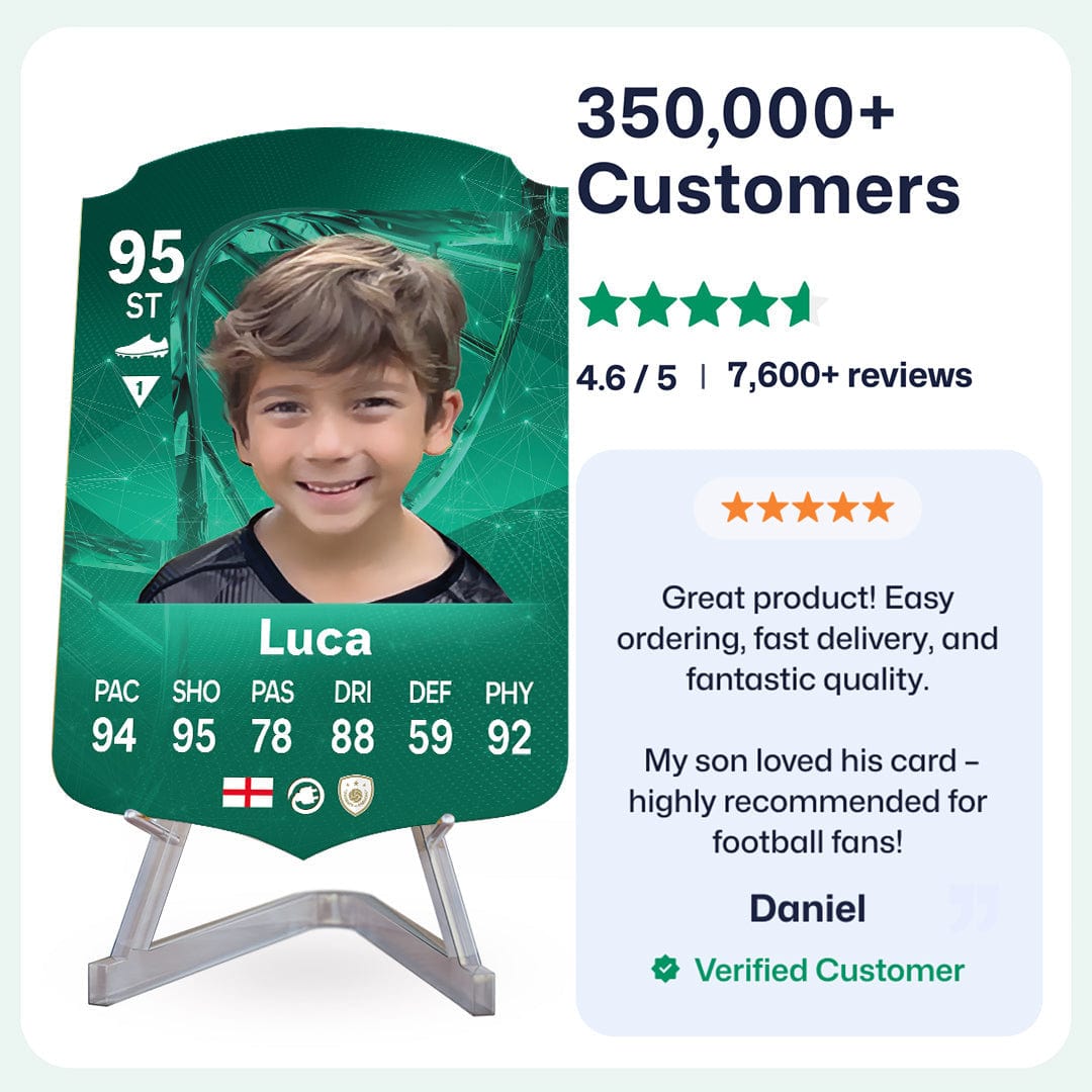 Once you’ve personalised your card, our design experts will edit your photo, design your card, and bring it to life in stunning quality. You’ll get a full preview before we print your card and every card’s quality is backed by our Gold Standard Guarantee. So far, over 350,000+ football fans agree: A CardsPlug football card is the ultimate football gift!