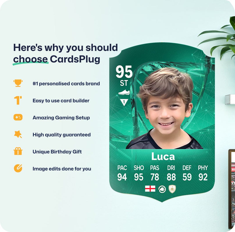CardsPlug is home to the world’s favourite personalised football cards. Our easy football card builder lets you make a real life football card with your own name, photo, and skill ratings. With 100+ designs to choose from and some inspired by EA SPORTS FC 26 cards seen in EA FC 26, EA FC 25 and FC 24 as well as FIFA cards seen in games like FIFA 23 and FIFA 22.