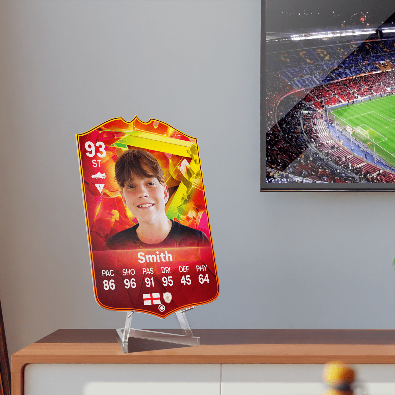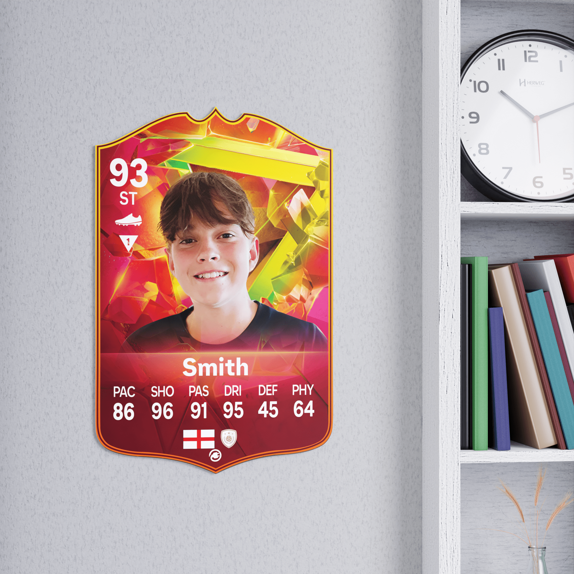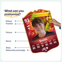 When it comes to personalising your card, the basic steps are to upload a photo and add a name to your card. Then you’ll add details like your player’s position and skill ratings out of 99 for each football skill shown on the card. Our online card builder makes this really easy. And if you aren’t a football card expert, don’t worry!