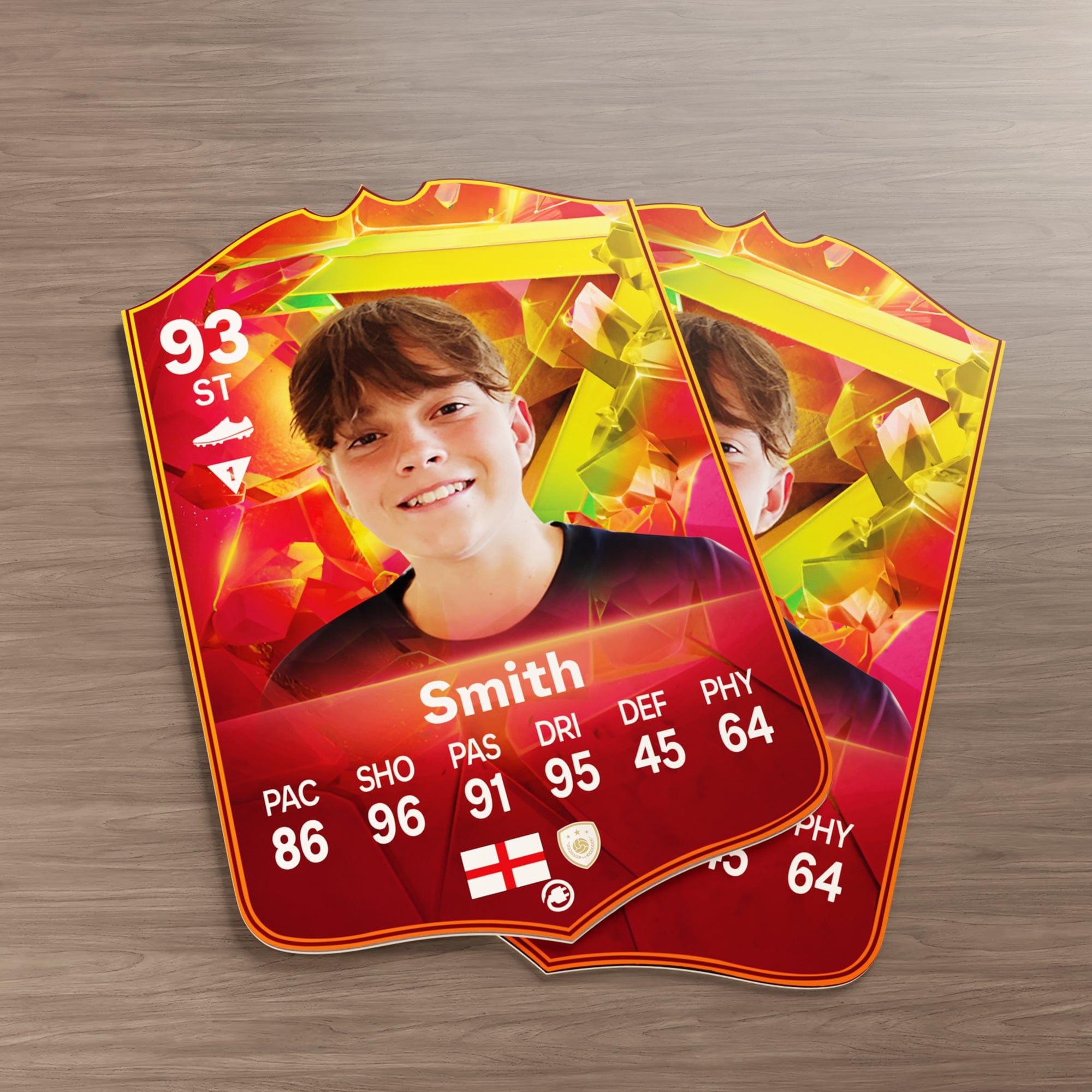 Our football card builder lets you choose between two different card materials. Our Standard cards are made of a ultra-strong variety of Foamex (not cardboard or foam!). This material has a lovely gloss finish and is also super durable. Our world-exclusive Metal football cards have a matte finish and are slightly heavier. Both look amazing and will last forever.