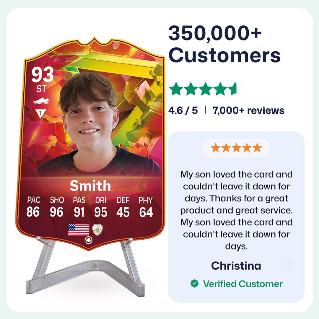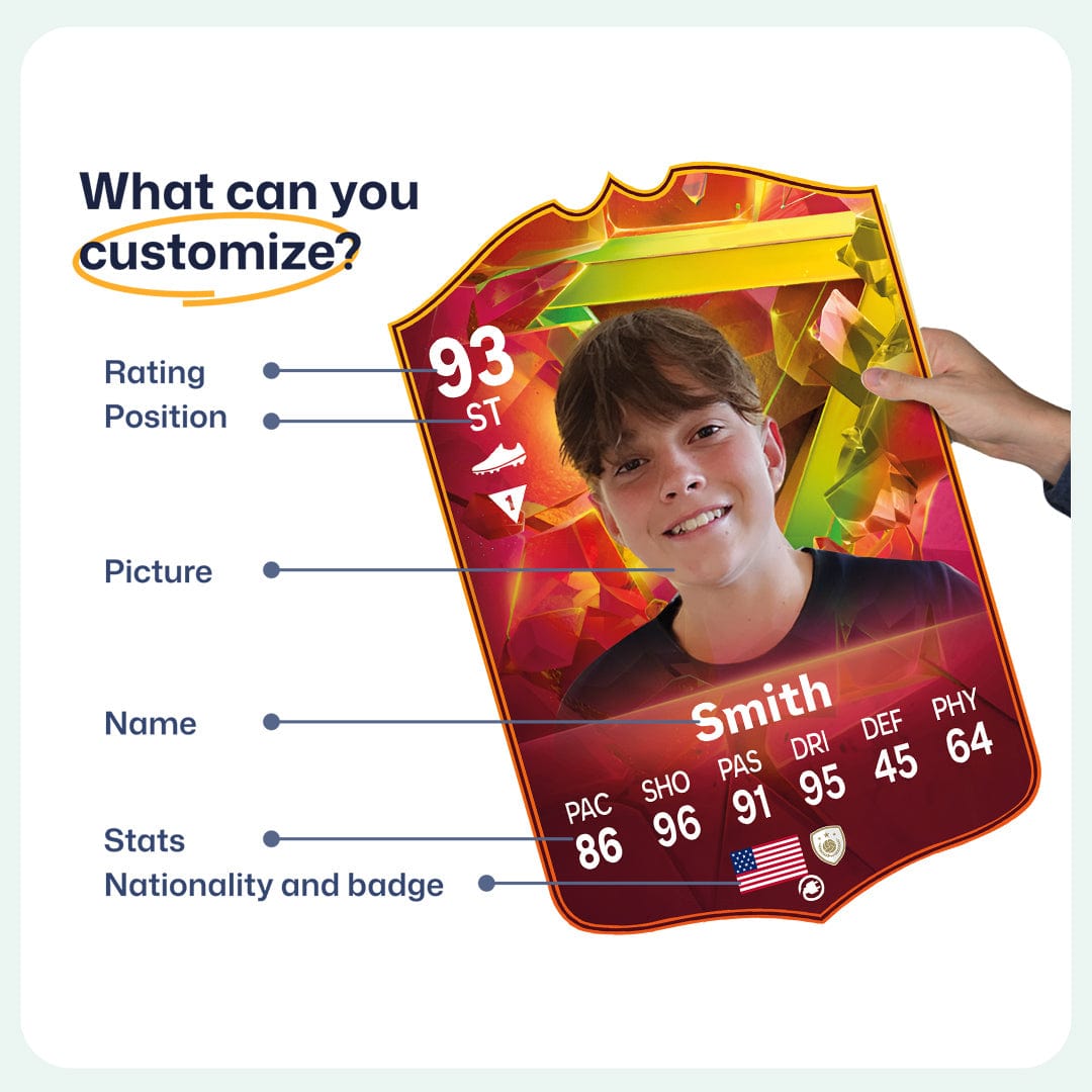 Yes! Our football card designers will remove the background from the photo you upload so it looks just like the football cards you might’ve seen games like EA FC 25, EA FC 24 or FIFA. We’ll also position the photo perfectly on the football card so it looks great. If there are any problems with the quality of your photo, we’ll reach out and let you know. Plus, our website's AI will remove the background on the image for visual purposes before purchase so you can see it without a background on the card.