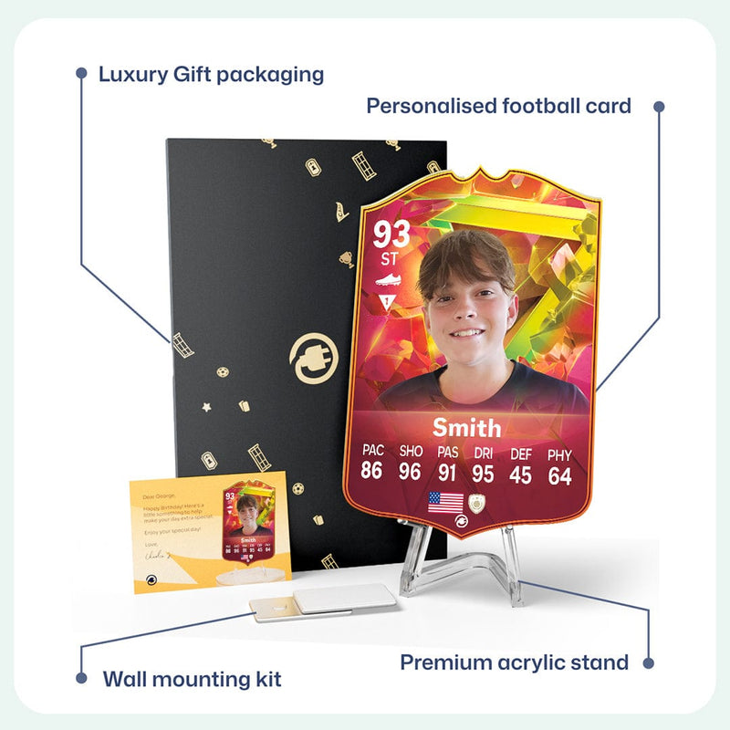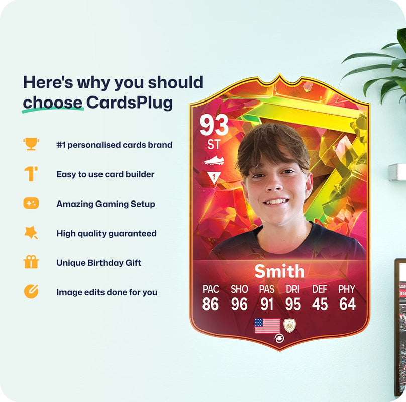 CardsPlug is home to the world’s favourite personalised football cards. Our easy football card builder lets you make a real life football card with your own name, photo, and skill ratings. With 100+ designs to choose from and some inspired by EA SPORTS FC 26 cards seen in EA FC 26, EA FC 25 and FC 24 as well as FIFA cards seen in games like FIFA 23 and FIFA 22.