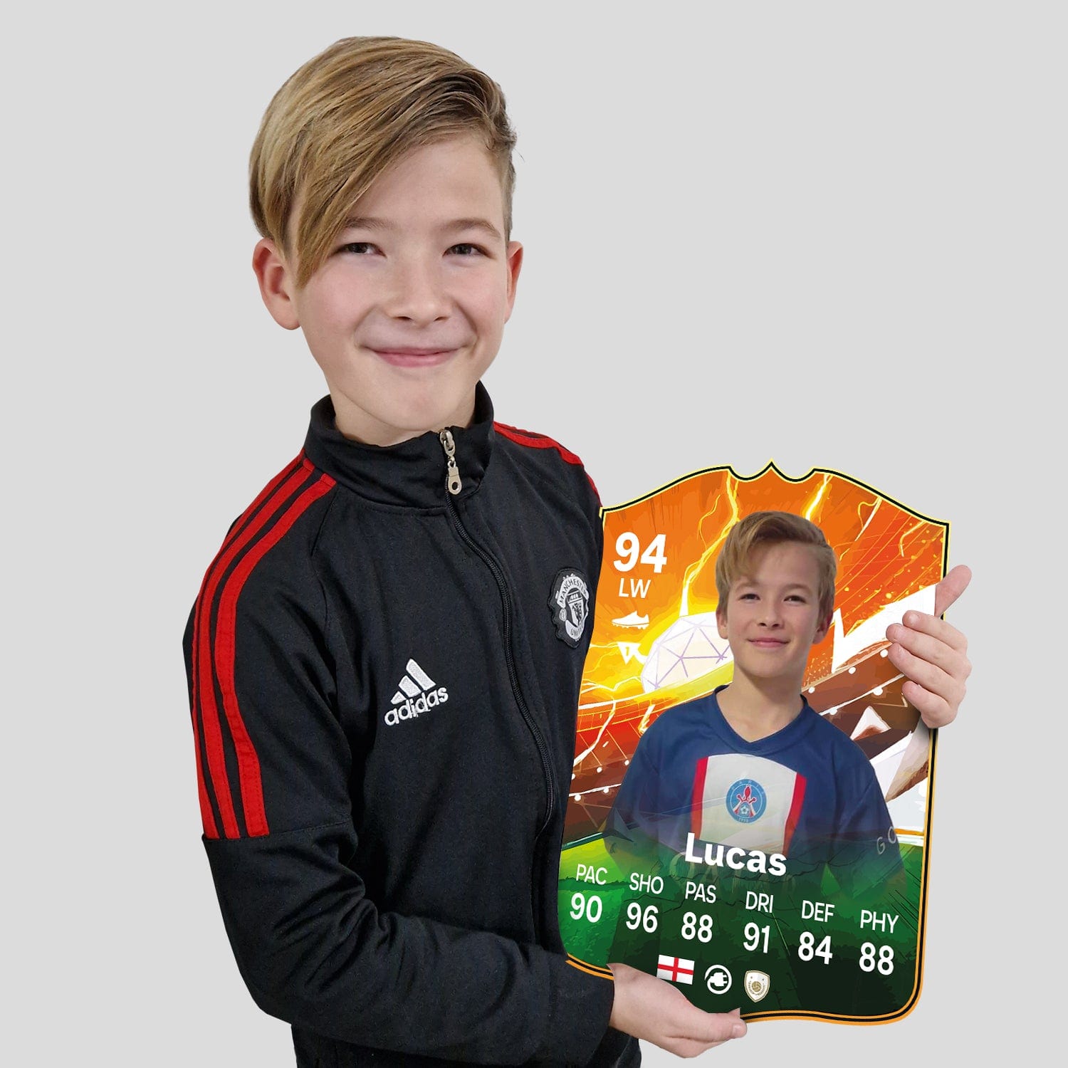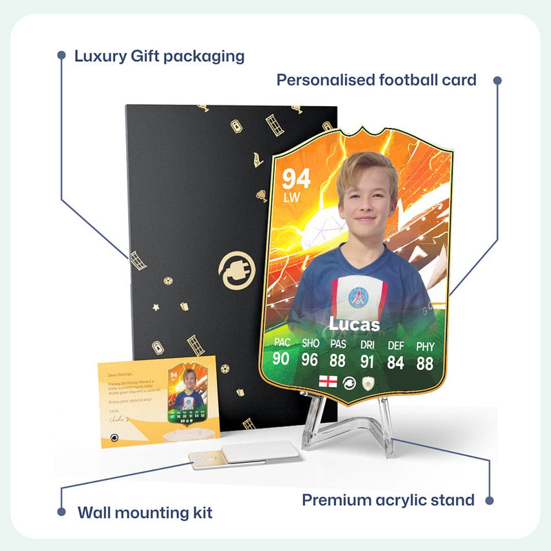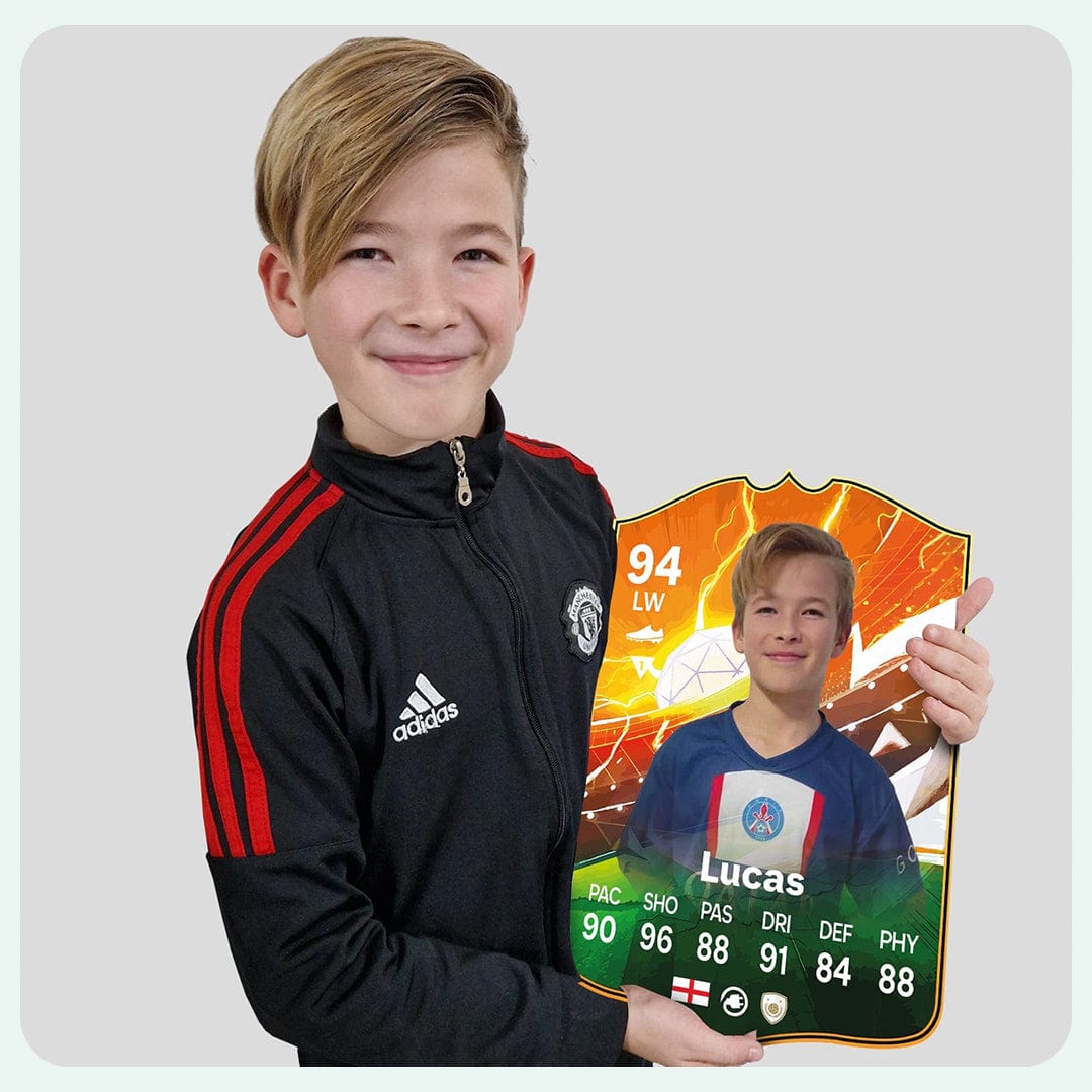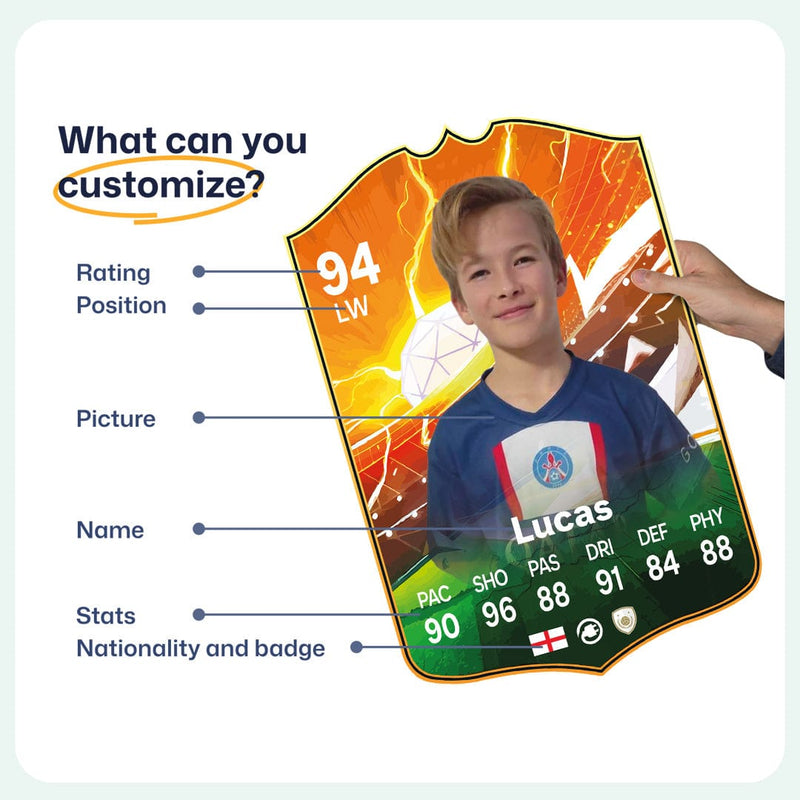 When it comes to personalising your card, the basic steps are to upload a photo and add a name to your card. Then you’ll add details like your player’s position and skill ratings out of 99 for each football skill shown on the card. Our online card builder makes this really easy. And if you aren’t a football card expert, don’t worry!