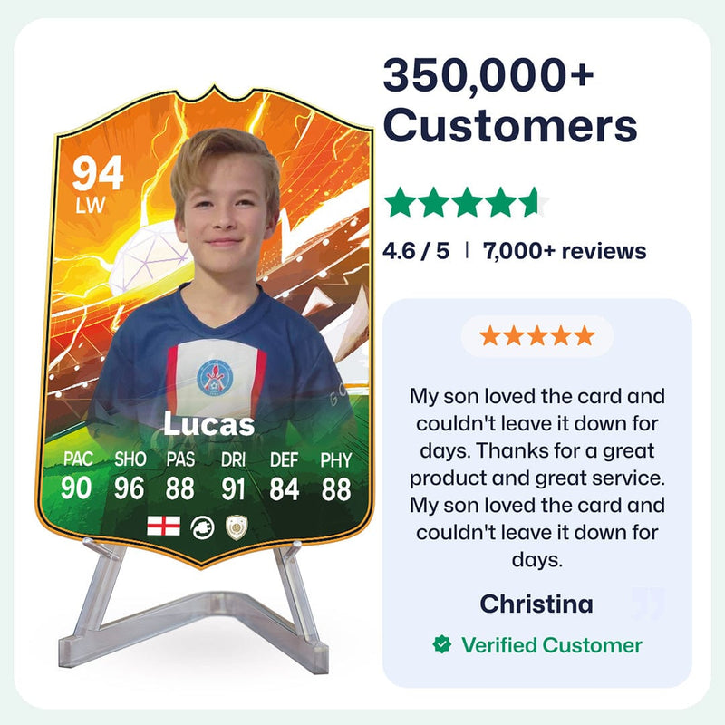 Yes! Our football card designers will remove the background from the photo you upload so it looks just like the football cards you might’ve seen games like EA FC 25, EA FC 24 or FIFA. We’ll also position the photo perfectly on the football card so it looks great. If there are any problems with the quality of your photo, we’ll reach out and let you know. Plus, our website's AI will remove the background on the image for visual purposes before purchase so you can see it without a background on the card.
