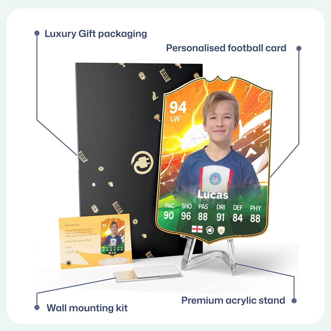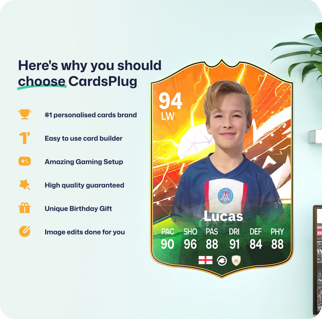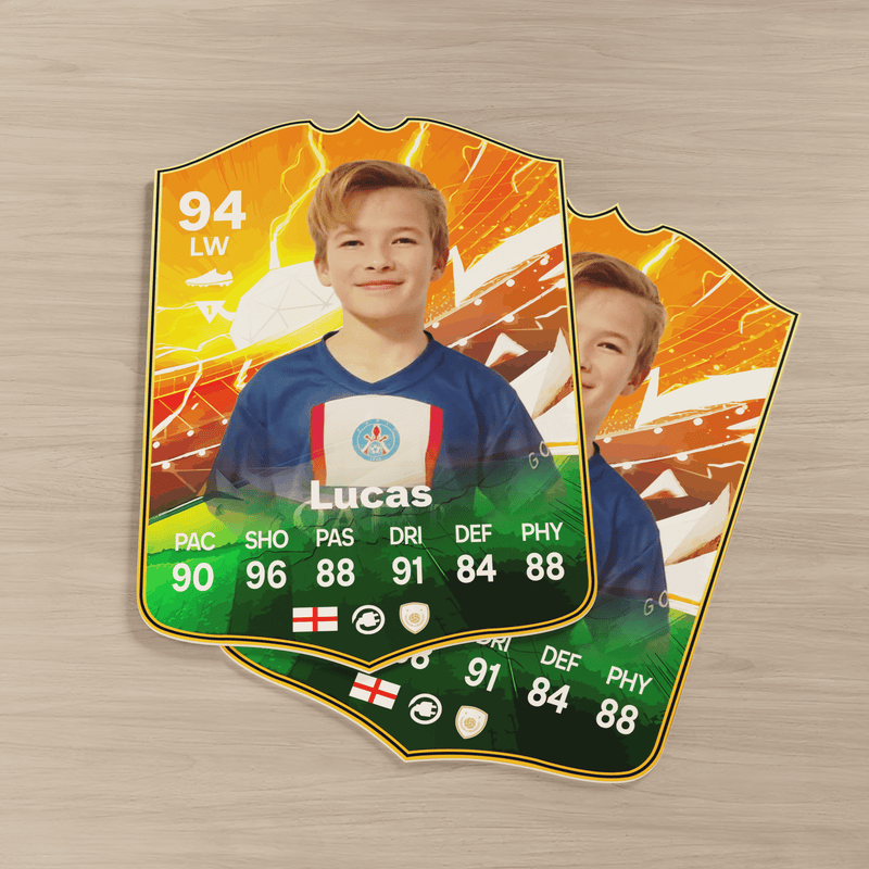 CardsPlug is home to the world’s favourite personalised football cards. Our easy football card builder lets you make a real life football card with your own name, photo, and skill ratings. With 100+ designs to choose from and some inspired by EA SPORTS FC 26 cards seen in EA FC 26, EA FC 25 and FC 24 as well as FIFA cards seen in games like FIFA 23 and FIFA 22.