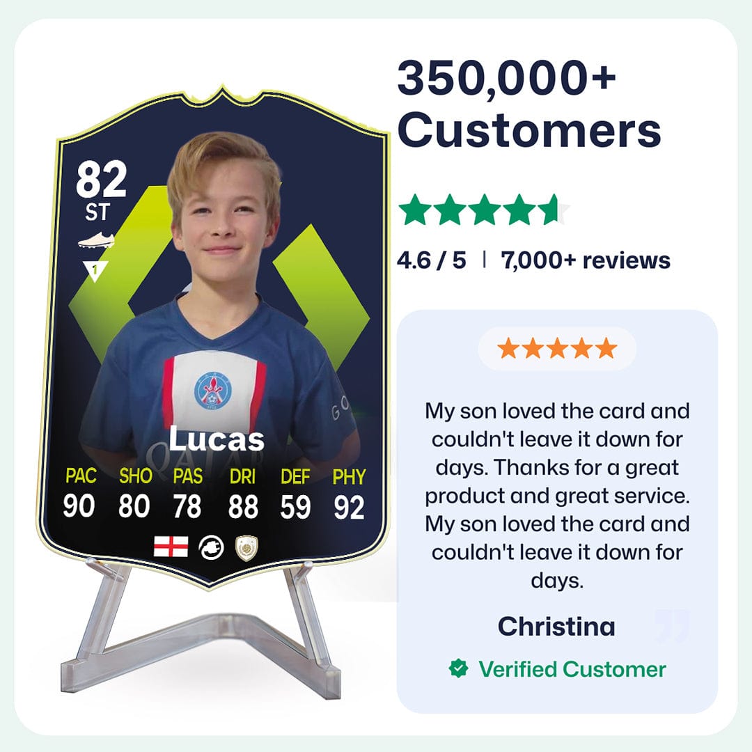 Yes! Our football card designers will remove the background from the photo you upload so it looks just like the football cards you might’ve seen games like EA FC 25, EA FC 24 or FIFA. We’ll also position the photo perfectly on the football card so it looks great. If there are any problems with the quality of your photo, we’ll reach out and let you know. Plus, our website's AI will remove the background on the image for visual purposes before purchase so you can see it without a background on the card.