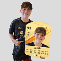 Our football card builder lets you choose between two different card materials. Our Standard cards are made of a ultra-strong variety of Foamex (not cardboard or foam!). This material has a lovely gloss finish and is also super durable. Our world-exclusive Metal football cards have a matte finish and are slightly heavier. Both look amazing and will last forever.