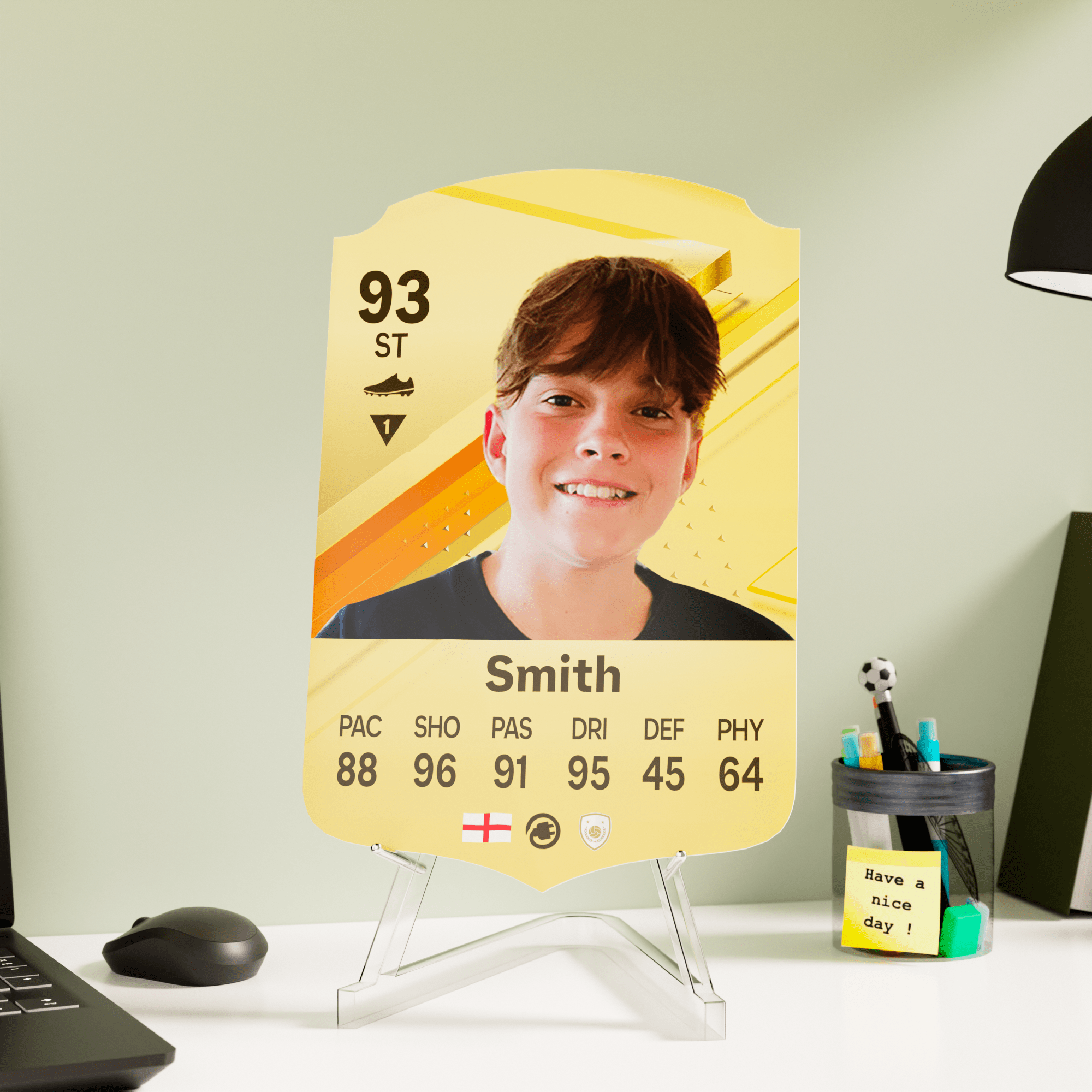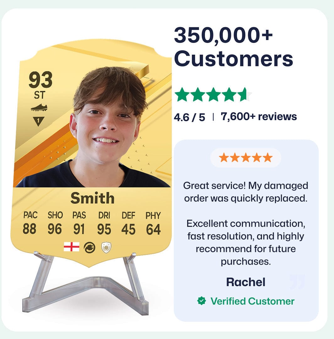 Yes! Our football card designers will remove the background from the photo you upload so it looks just like the football cards you might’ve seen games like EA FC 25, EA FC 24 or FIFA. We’ll also position the photo perfectly on the football card so it looks great. If there are any problems with the quality of your photo, we’ll reach out and let you know. Plus, our website's AI will remove the background on the image for visual purposes before purchase so you can see it without a background on the card.