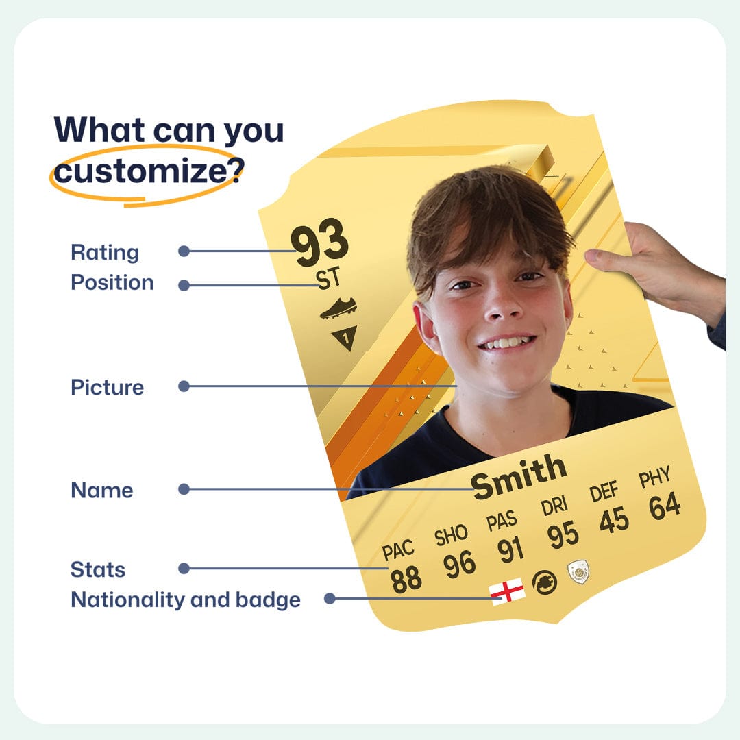When it comes to personalising your card, the basic steps are to upload a photo and add a name to your card. Then you’ll add details like your player’s position and skill ratings out of 99 for each football skill shown on the card. Our online card builder makes this really easy. And if you aren’t a football card expert, don’t worry!
