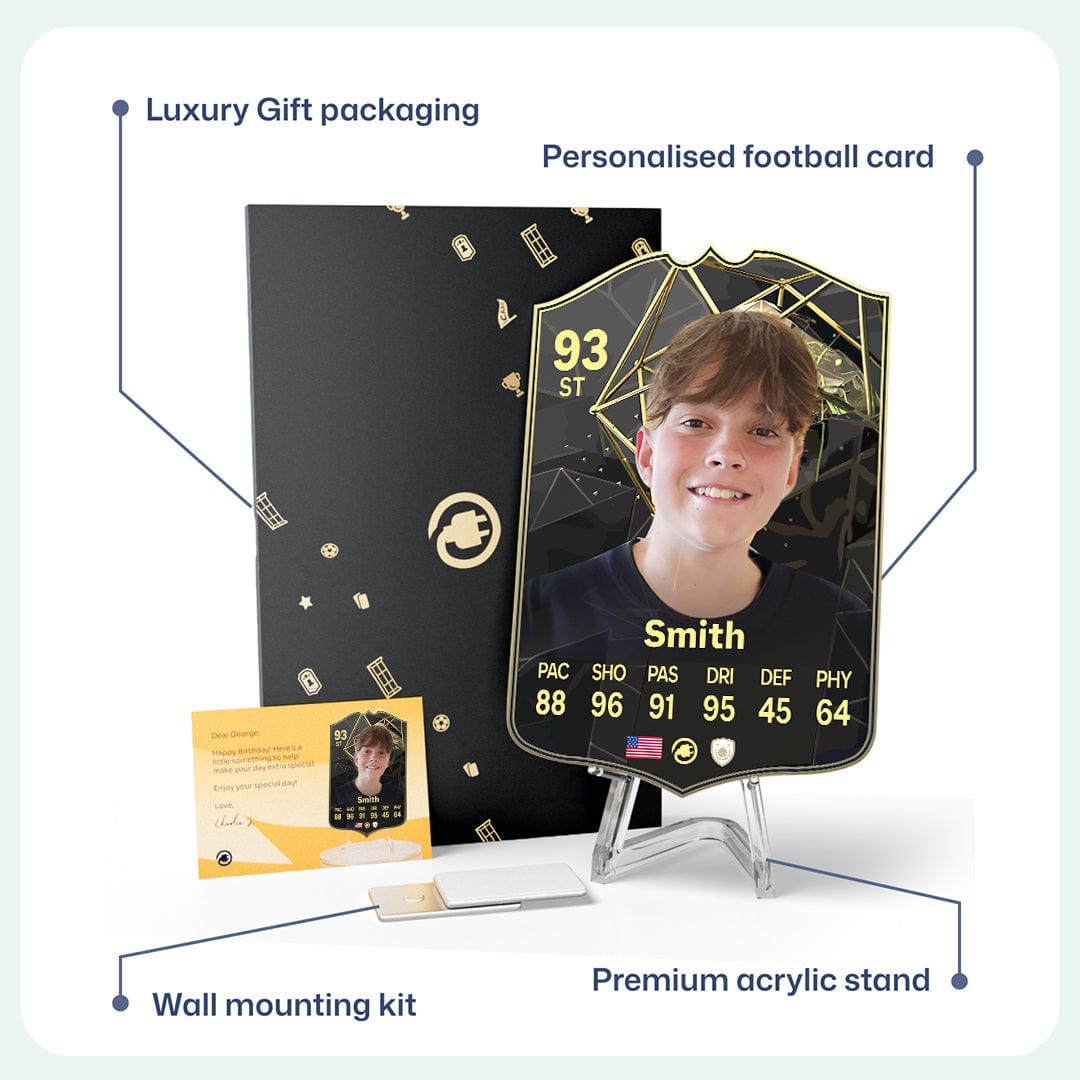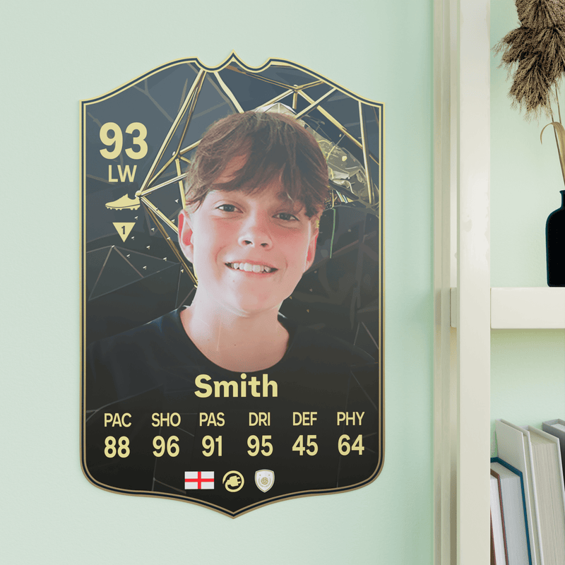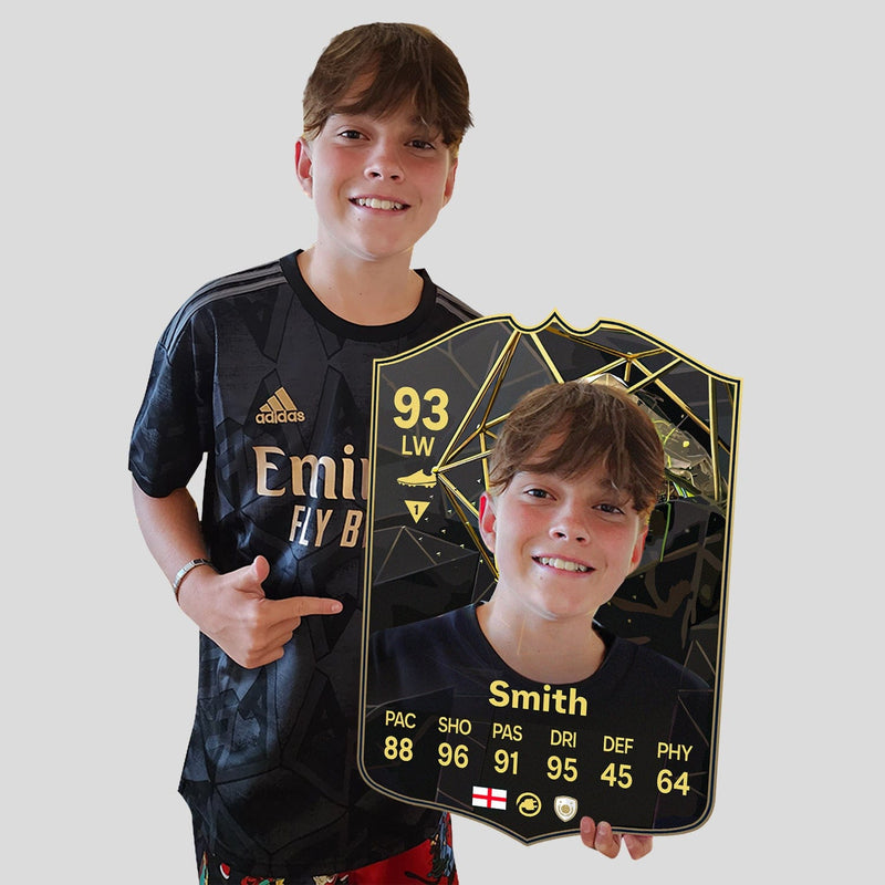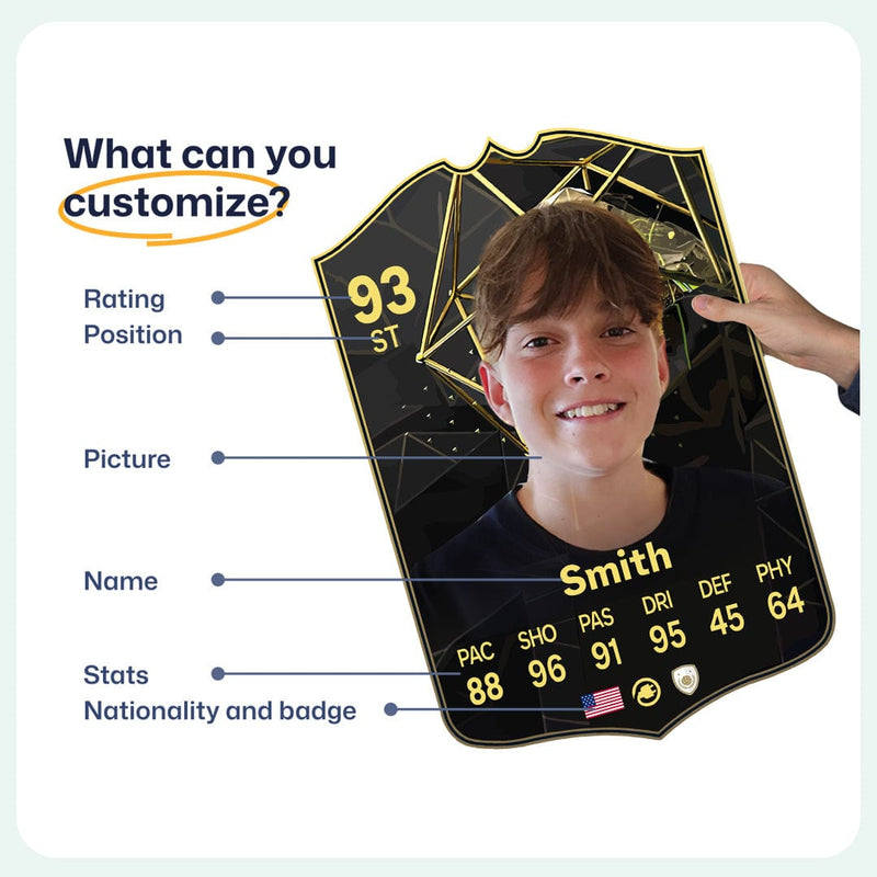 When it comes to personalising your card, the basic steps are to upload a photo and add a name to your card. Then you’ll add details like your player’s position and skill ratings out of 99 for each football skill shown on the card. Our online card builder makes this really easy. And if you aren’t a football card expert, don’t worry!