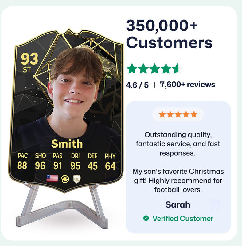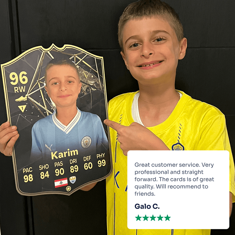 Yes! Our football card designers will remove the background from the photo you upload so it looks just like the football cards you might’ve seen games like EA FC 25, EA FC 24 or FIFA. We’ll also position the photo perfectly on the football card so it looks great. If there are any problems with the quality of your photo, we’ll reach out and let you know. Plus, our website's AI will remove the background on the image for visual purposes before purchase so you can see it without a background on the card.
