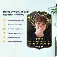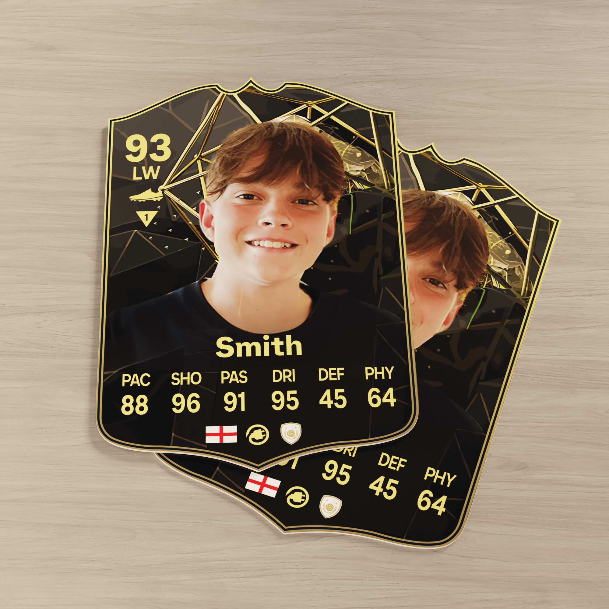 CardsPlug is home to the world’s favourite personalised football cards. Our easy football card builder lets you make a real life football card with your own name, photo, and skill ratings. With 100+ designs to choose from and some inspired by EA SPORTS FC 26 cards seen in EA FC 26, EA FC 25 and FC 24 as well as FIFA cards seen in games like FIFA 23 and FIFA 22.