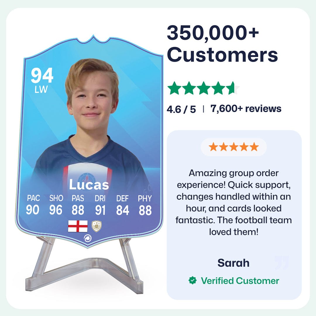 Once you’ve personalised your card, our design experts will edit your photo, design your card, and bring it to life in stunning quality. You’ll get a full preview before we print your card and every card’s quality is backed by our Gold Standard Guarantee. So far, over 350,000+ football fans agree: A CardsPlug football card is the ultimate football gift!