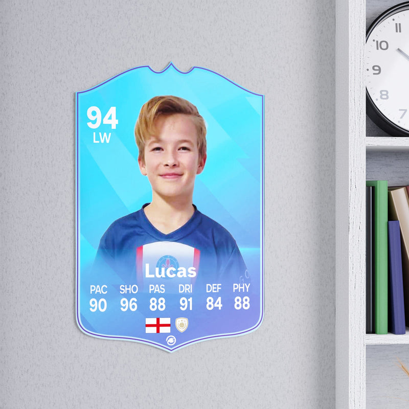 When it comes to personalising your card, the basic steps are to upload a photo and add a name to your card. Then you’ll add details like your player’s position and skill ratings out of 99 for each football skill shown on the card. Our online card builder makes this really easy. And if you aren’t a football card expert, don’t worry!