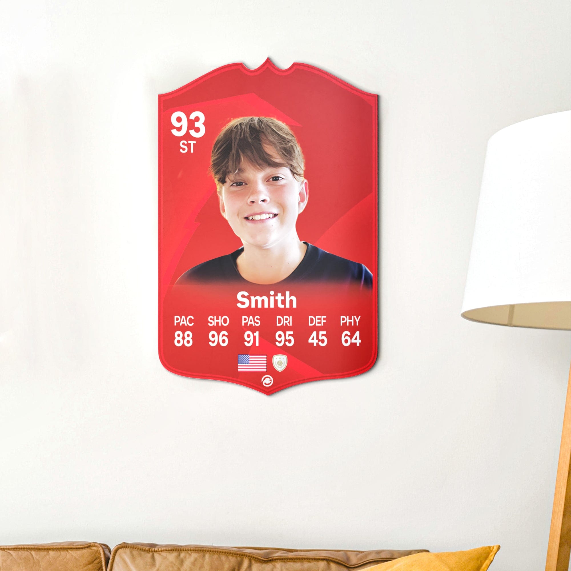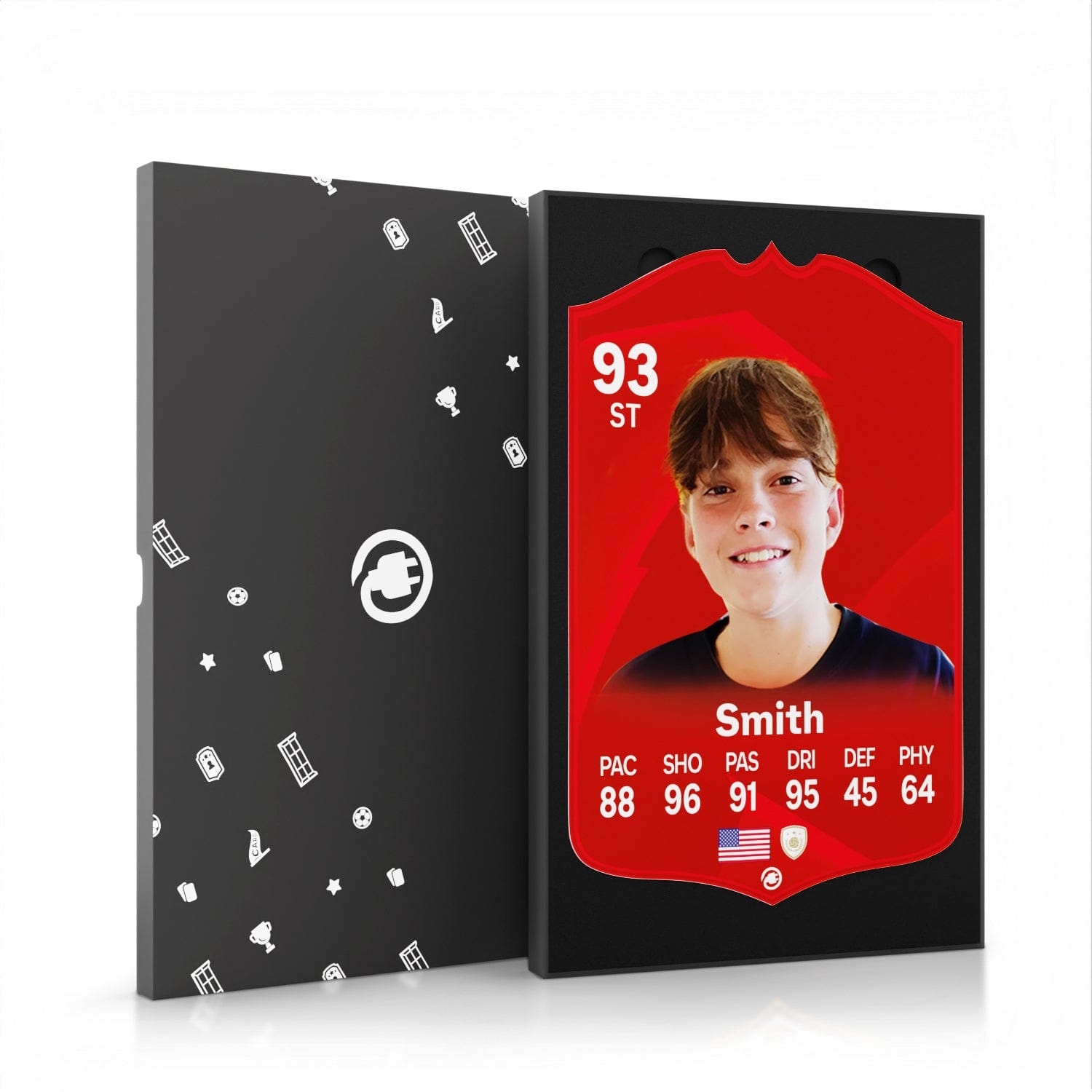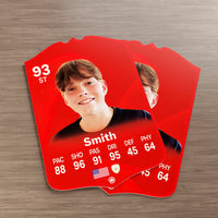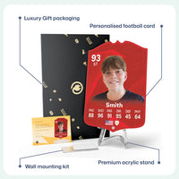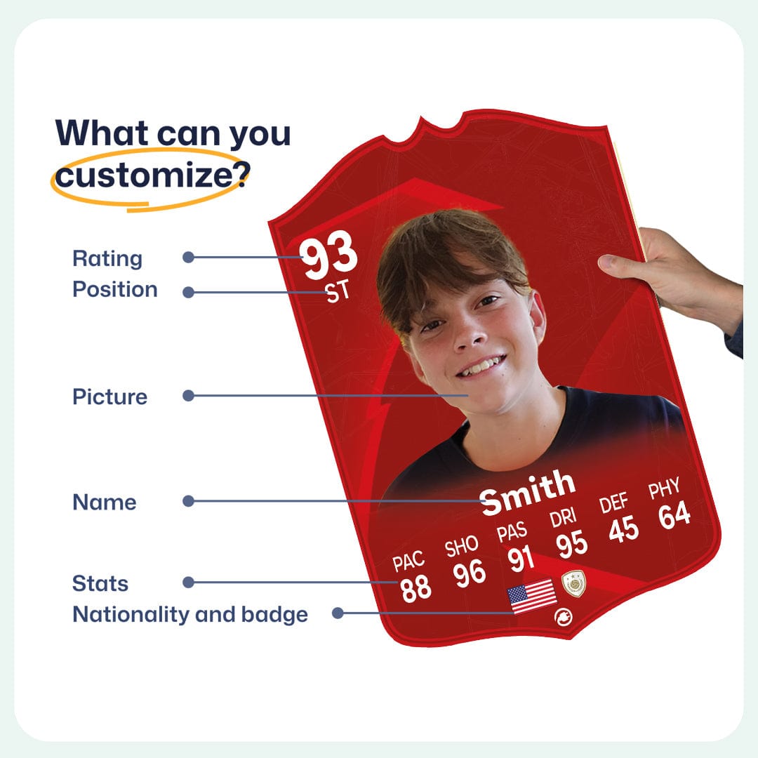 When it comes to personalising your card, the basic steps are to upload a photo and add a name to your card. Then you’ll add details like your player’s position and skill ratings out of 99 for each football skill shown on the card. Our online card builder makes this really easy. And if you aren’t a football card expert, don’t worry!
