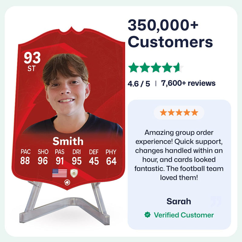 Yes! Our football card designers will remove the background from the photo you upload so it looks just like the football cards you might’ve seen games like EA FC 25, EA FC 24 or FIFA. We’ll also position the photo perfectly on the football card so it looks great. If there are any problems with the quality of your photo, we’ll reach out and let you know. Plus, our website's AI will remove the background on the image for visual purposes before purchase so you can see it without a background on the card.