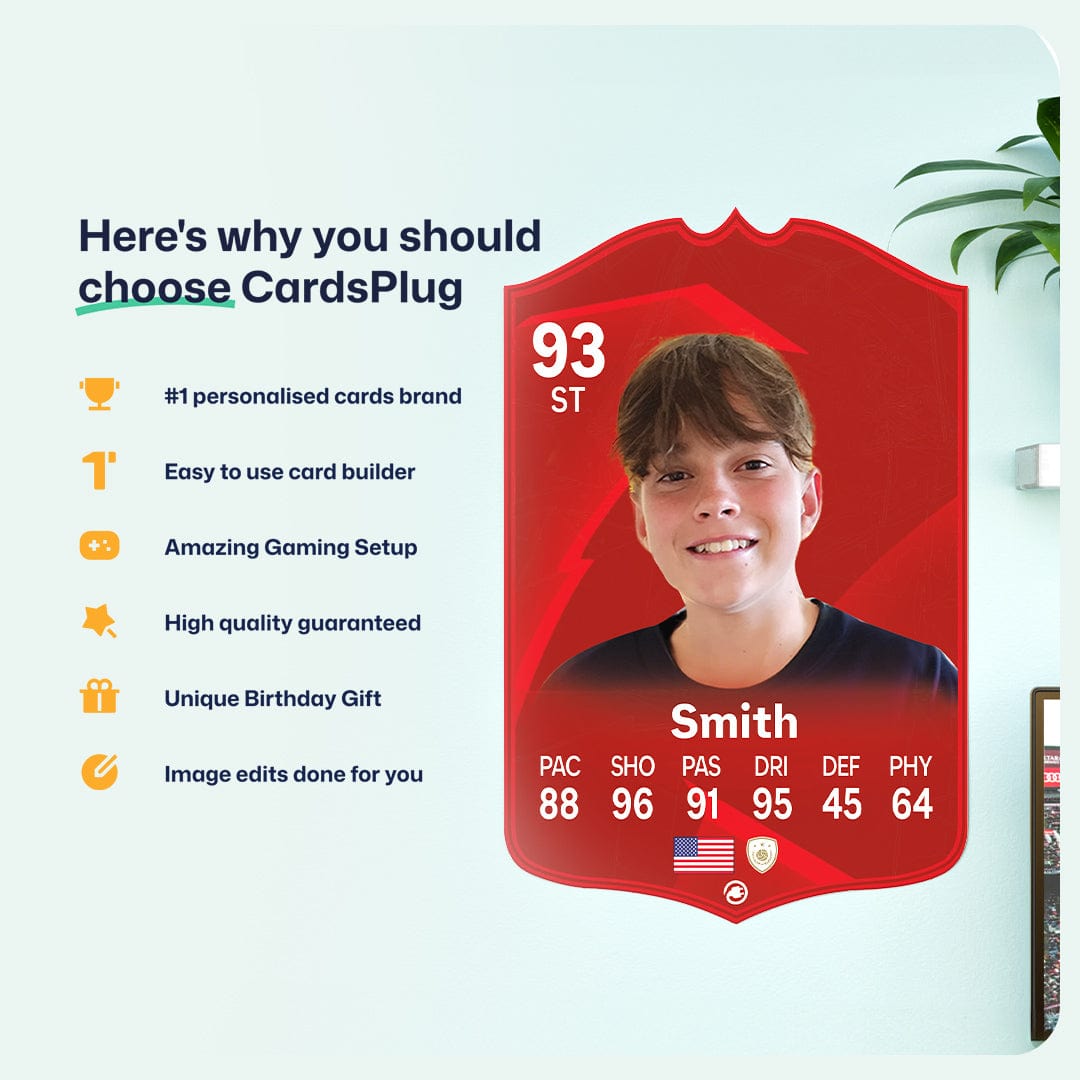 CardsPlug is home to the world’s favourite personalised football cards. Our easy football card builder lets you make a real life football card with your own name, photo, and skill ratings. With 100+ designs to choose from and some inspired by EA SPORTS FC 26 cards seen in EA FC 26, EA FC 25 and FC 24 as well as FIFA cards seen in games like FIFA 23 and FIFA 22.