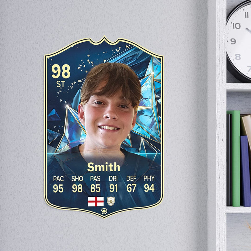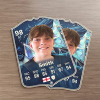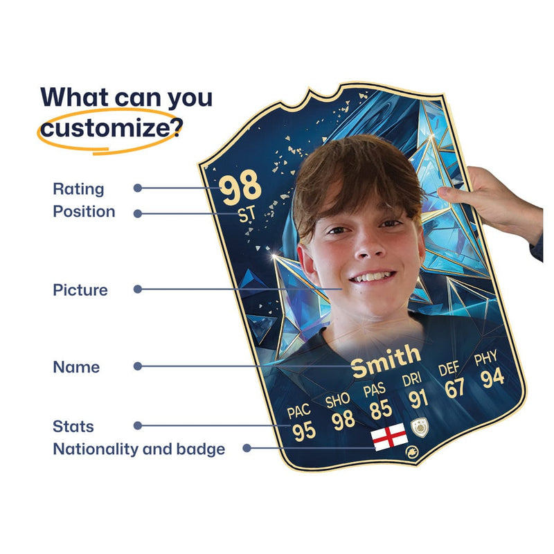 When it comes to personalising your card, the basic steps are to upload a photo and add a name to your card. Then you’ll add details like your player’s position and skill ratings out of 99 for each football skill shown on the card. Our online card builder makes this really easy. And if you aren’t a football card expert, don’t worry!