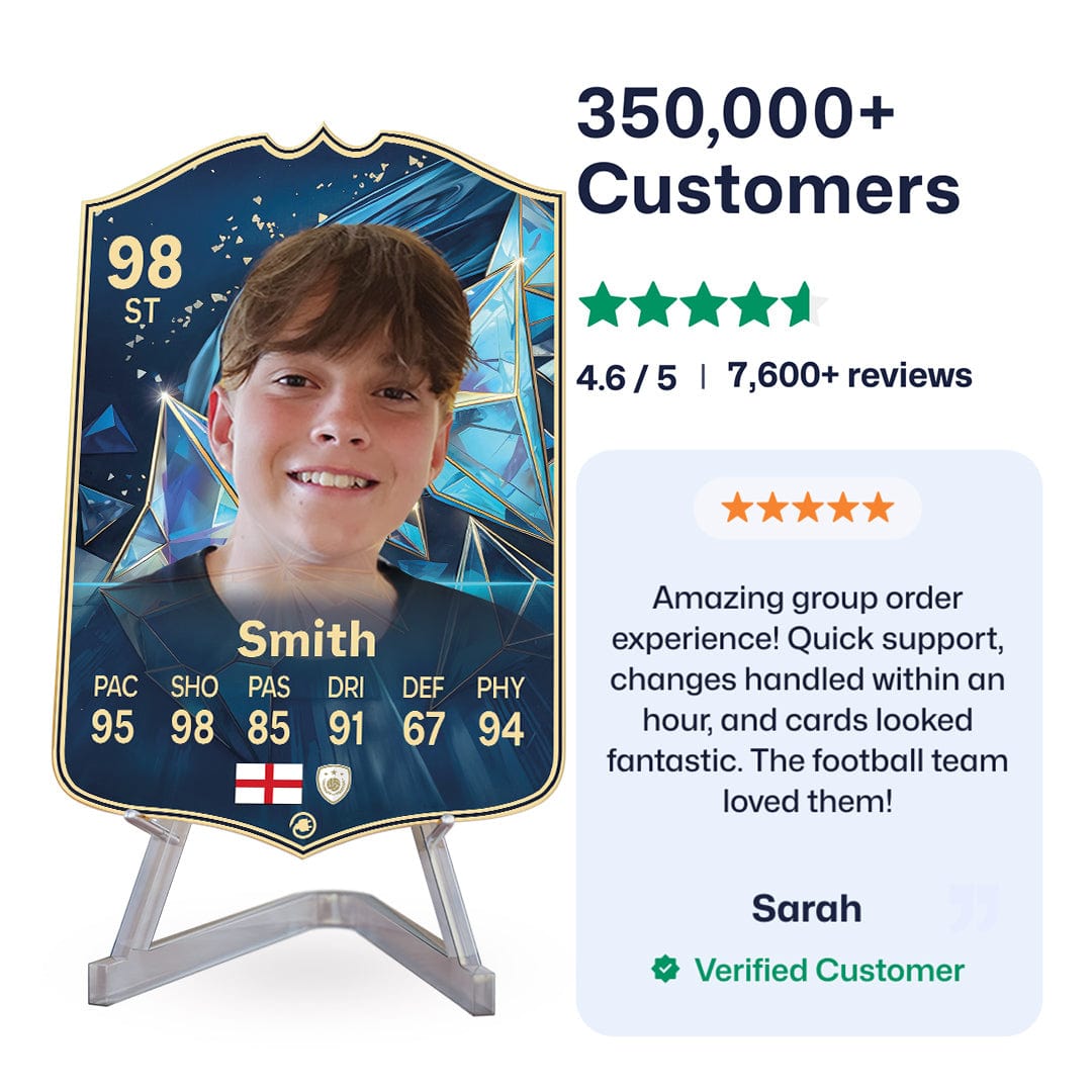 Once you’ve personalised your card, our design experts will edit your photo, design your card, and bring it to life in stunning quality. You’ll get a full preview before we print your card and every card’s quality is backed by our Gold Standard Guarantee. So far, over 350,000+ football fans agree: A CardsPlug football card is the ultimate football gift!