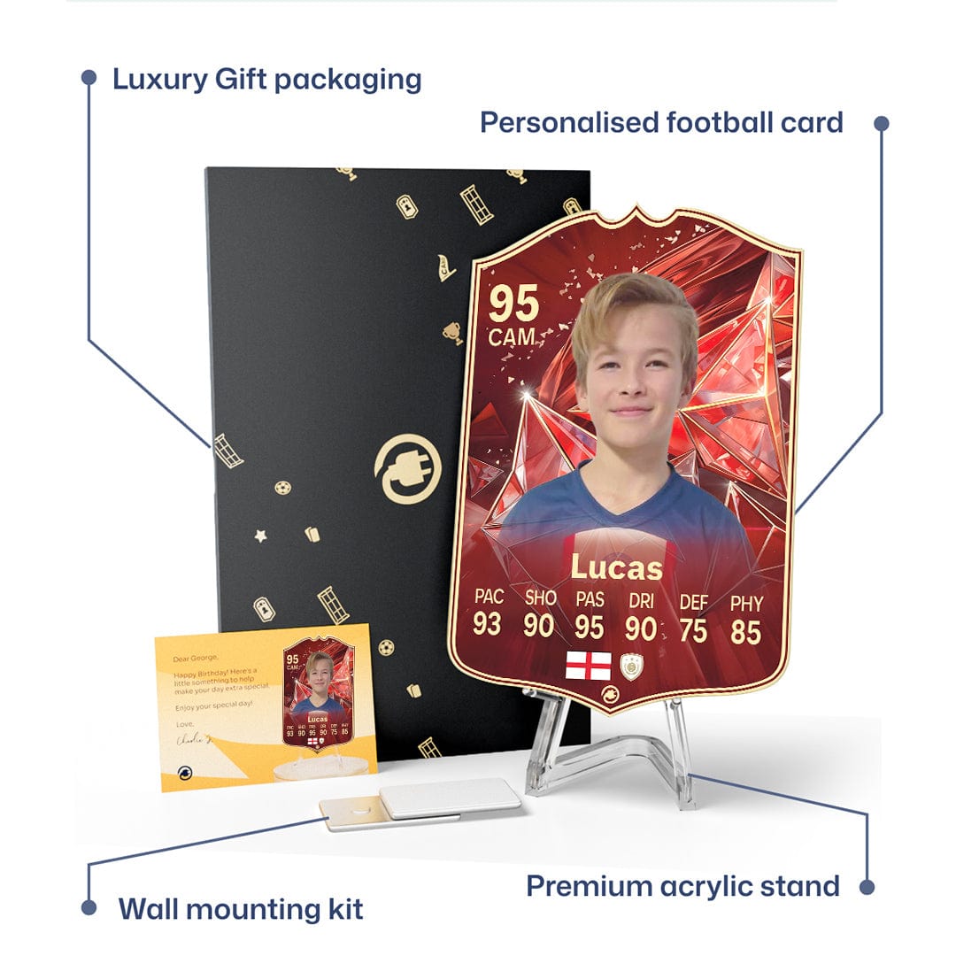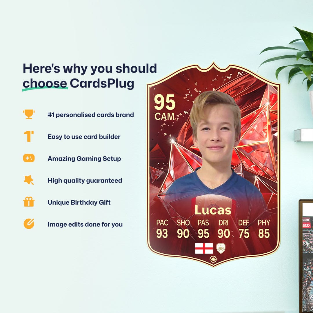 CardsPlug is home to the world’s favourite personalised football cards. Our easy football card builder lets you make a real life football card with your own name, photo, and skill ratings. With 100+ designs to choose from and some inspired by EA SPORTS FC 26 cards seen in EA FC 26, EA FC 25 and FC 24 as well as FIFA cards seen in games like FIFA 23 and FIFA 22.