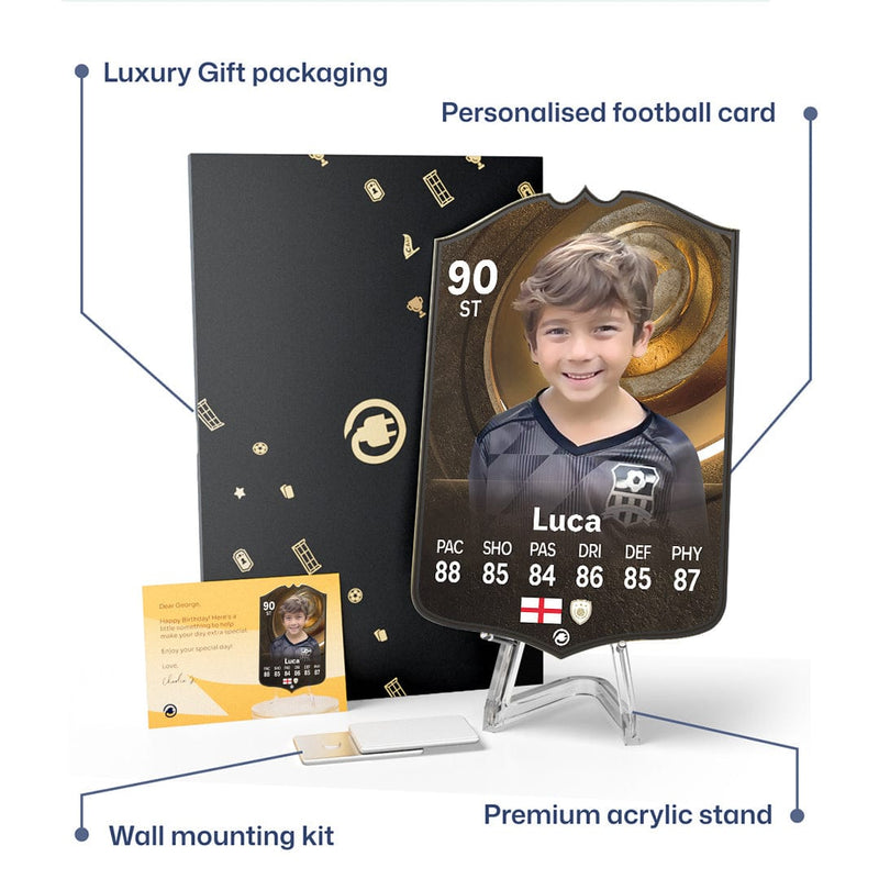 When it comes to personalising your card, the basic steps are to upload a photo and add a name to your card. Then you’ll add details like your player’s position and skill ratings out of 99 for each football skill shown on the card. Our online card builder makes this really easy. And if you aren’t a football card expert, don’t worry!
