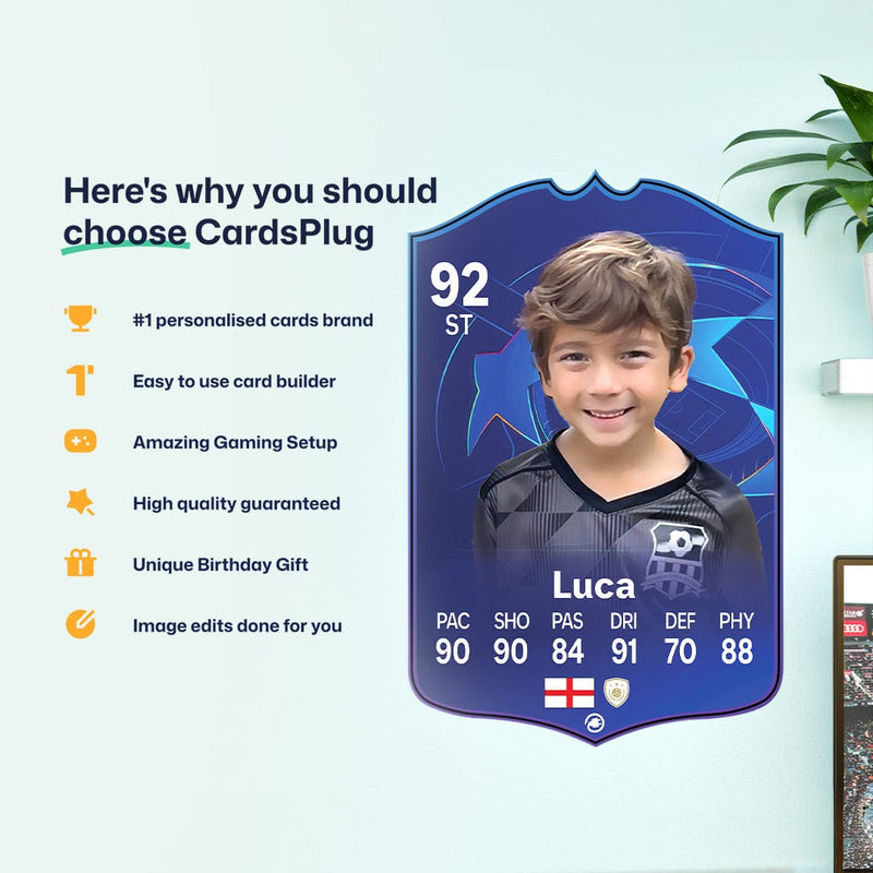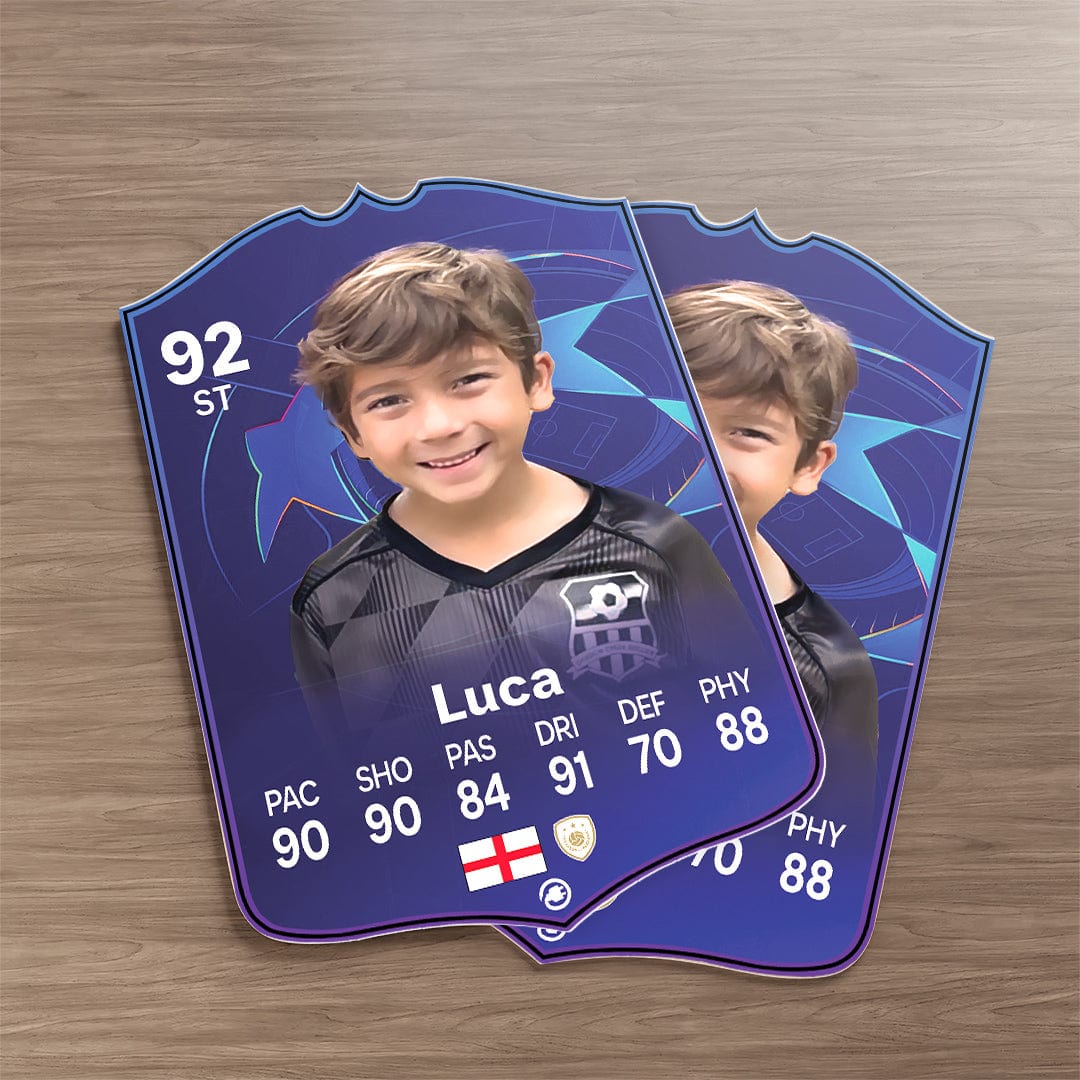 CardsPlug is home to the world’s favourite personalised football cards. Our easy football card builder lets you make a real life football card with your own name, photo, and skill ratings. With 100+ designs to choose from and some inspired by EA SPORTS FC 26 cards seen in EA FC 26, EA FC 25 and FC 24 as well as FIFA cards seen in games like FIFA 23 and FIFA 22.