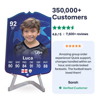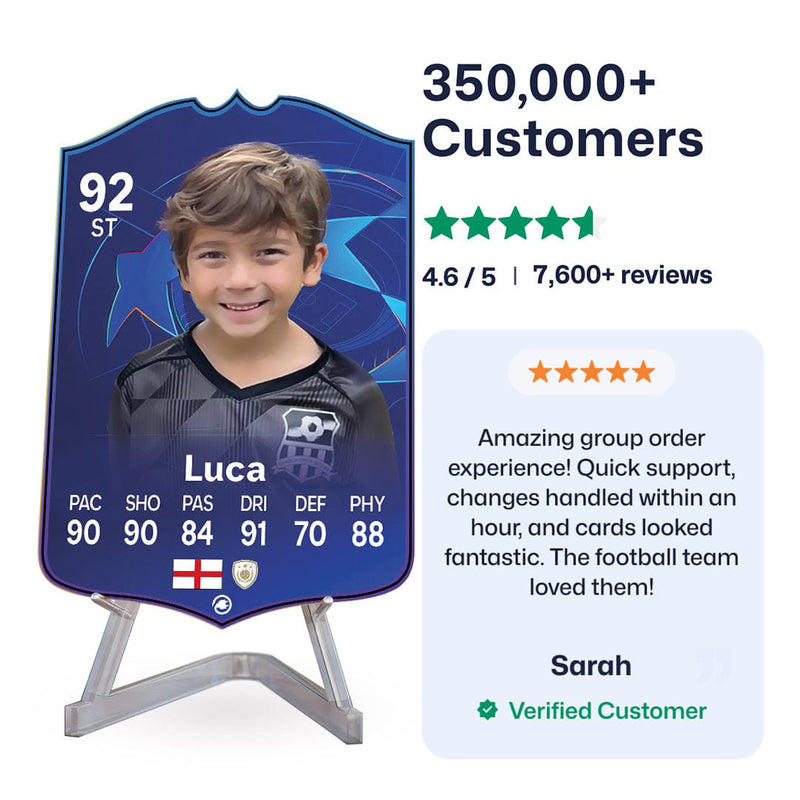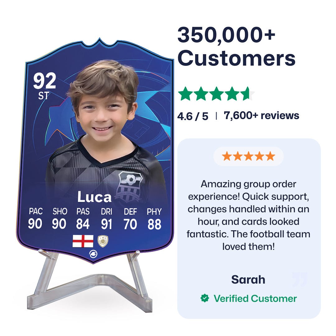 Yes! Our football card designers will remove the background from the photo you upload so it looks just like the football cards you might’ve seen games like EA FC 25, EA FC 24 or FIFA. We’ll also position the photo perfectly on the football card so it looks great. If there are any problems with the quality of your photo, we’ll reach out and let you know. Plus, our website's AI will remove the background on the image for visual purposes before purchase so you can see it without a background on the card.