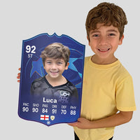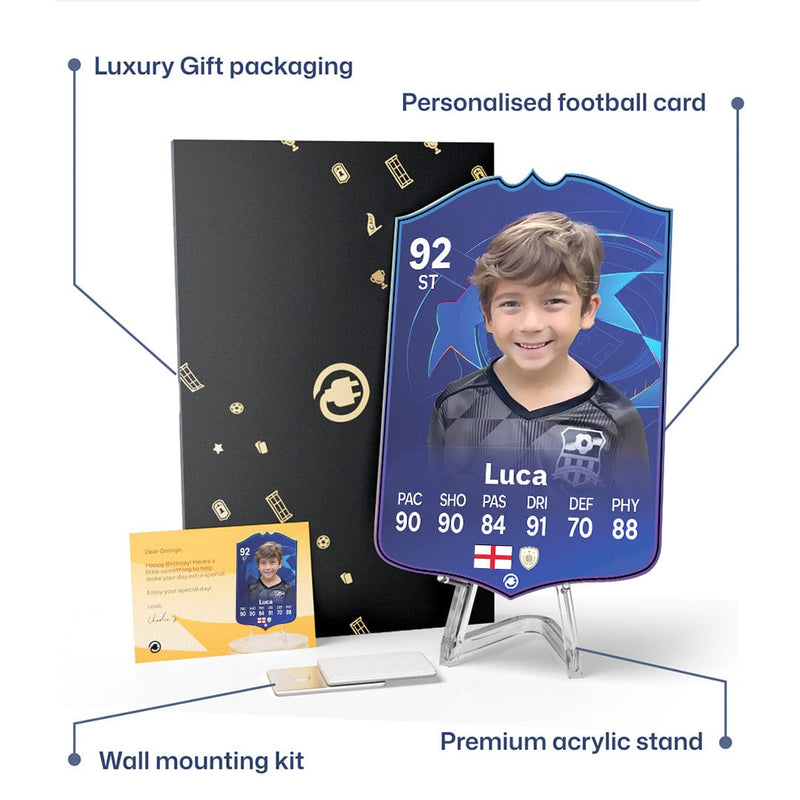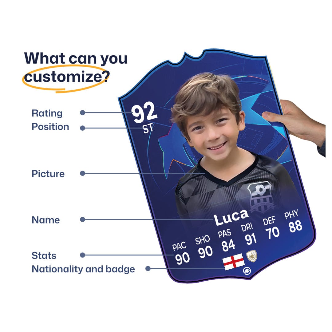 When it comes to personalising your card, the basic steps are to upload a photo and add a name to your card. Then you’ll add details like your player’s position and skill ratings out of 99 for each football skill shown on the card. Our online card builder makes this really easy. And if you aren’t a football card expert, don’t worry!