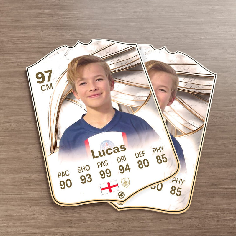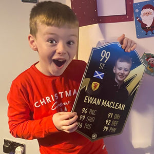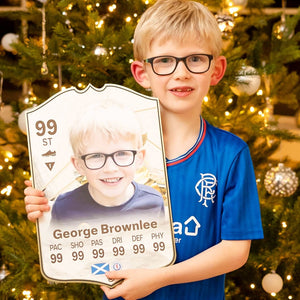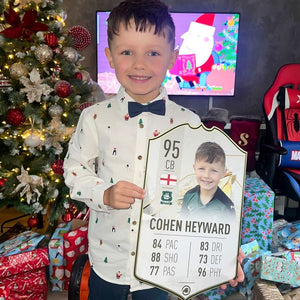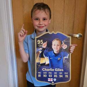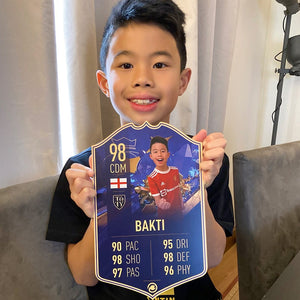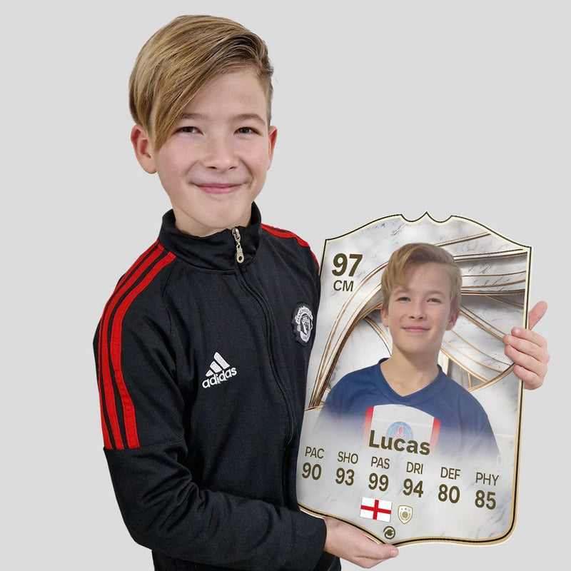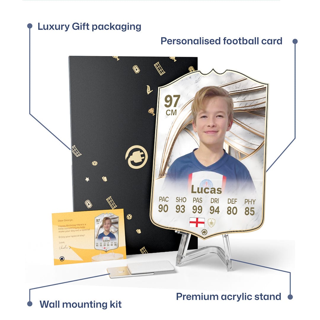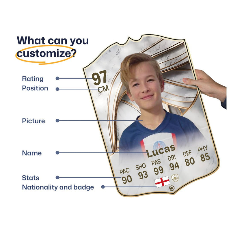When it comes to personalising your card, the basic steps are to upload a photo and add a name to your card. Then you’ll add details like your player’s position and skill ratings out of 99 for each football skill shown on the card. Our online card builder makes this really easy. And if you aren’t a football card expert, don’t worry!