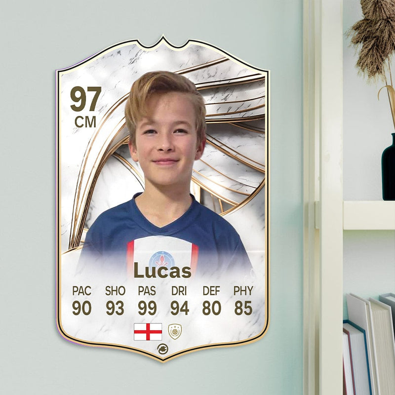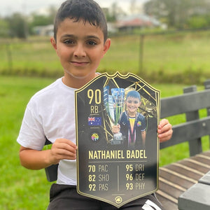Our football card builder lets you choose between two different card materials. Our Standard cards are made of a ultra-strong variety of Foamex (not cardboard or foam!). This material has a lovely gloss finish and is also super durable. Our world-exclusive Metal football cards have a matte finish and are slightly heavier. Both look amazing and will last forever.