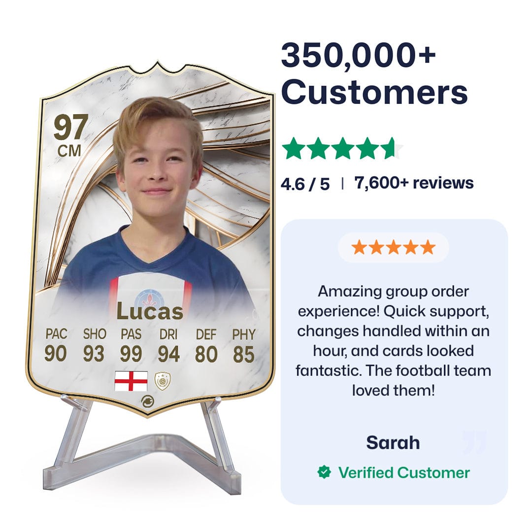 Once you’ve personalised your card, our design experts will edit your photo, design your card, and bring it to life in stunning quality. You’ll get a full preview before we print your card and every card’s quality is backed by our Gold Standard Guarantee. So far, over 350,000+ football fans agree: A CardsPlug football card is the ultimate football gift!