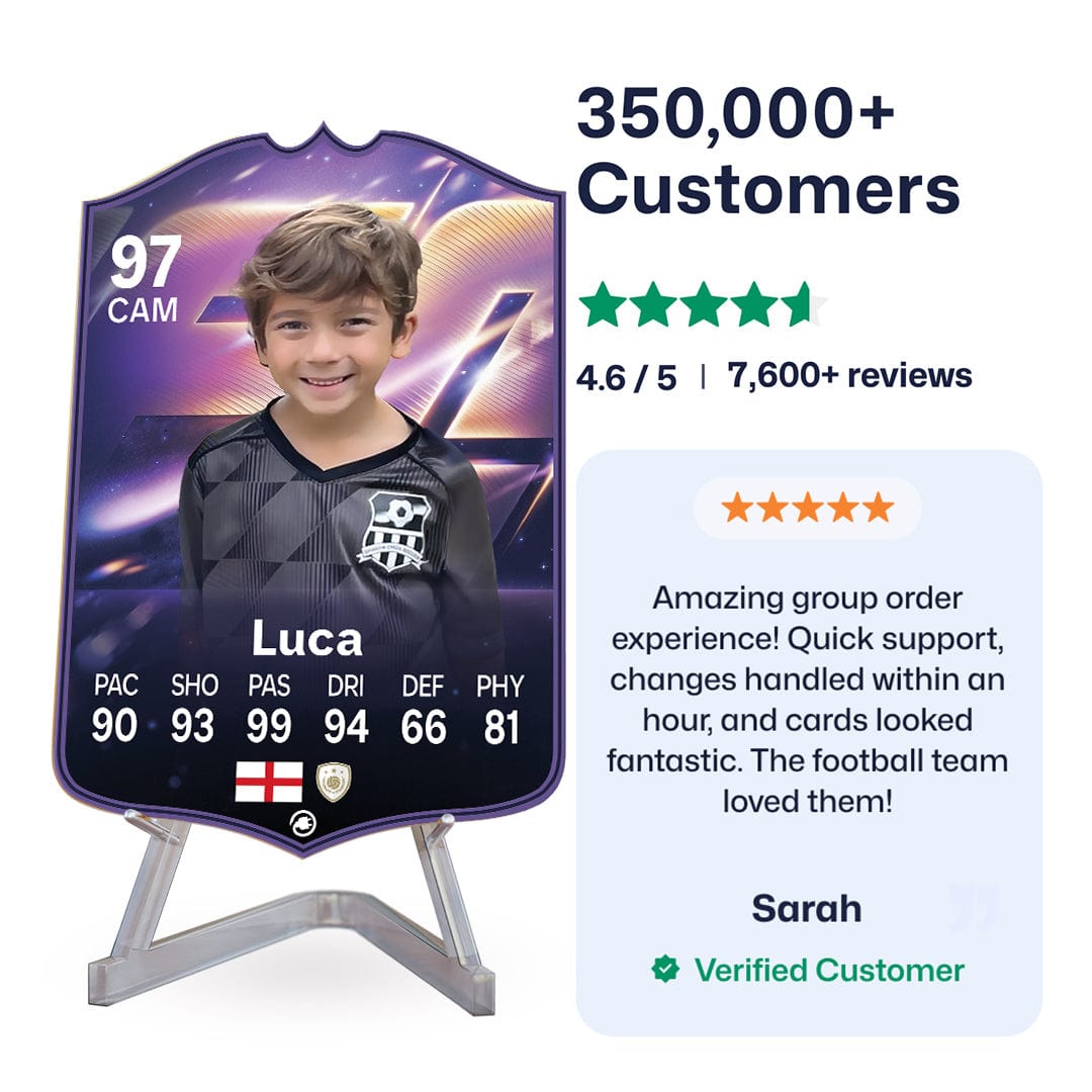 Yes! Our football card designers will remove the background from the photo you upload so it looks just like the football cards you might’ve seen games like EA FC 25, EA FC 24 or FIFA. We’ll also position the photo perfectly on the football card so it looks great. If there are any problems with the quality of your photo, we’ll reach out and let you know. Plus, our website's AI will remove the background on the image for visual purposes before purchase so you can see it without a background on the card.