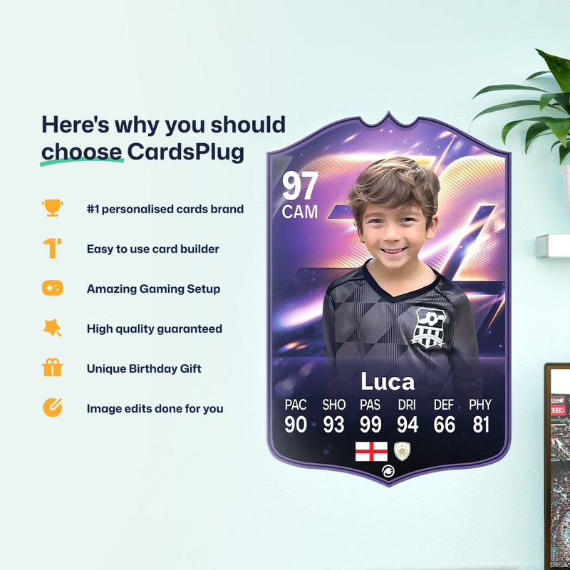 CardsPlug is home to the world’s favourite personalised football cards. Our easy football card builder lets you make a real life football card with your own name, photo, and skill ratings. With 100+ designs to choose from and some inspired by EA SPORTS FC 26 cards seen in EA FC 26, EA FC 25 and FC 24 as well as FIFA cards seen in games like FIFA 23 and FIFA 22.