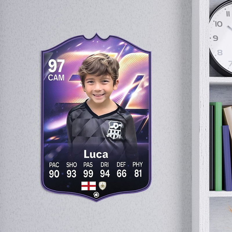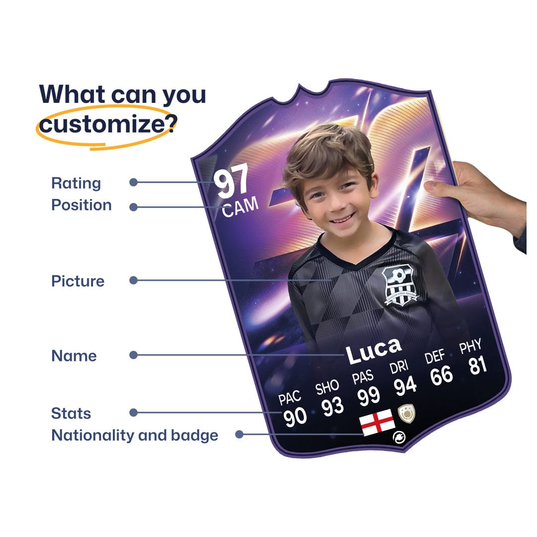 When it comes to personalising your card, the basic steps are to upload a photo and add a name to your card. Then you’ll add details like your player’s position and skill ratings out of 99 for each football skill shown on the card. Our online card builder makes this really easy. And if you aren’t a football card expert, don’t worry!