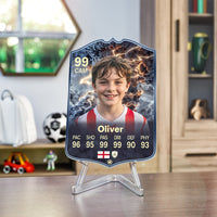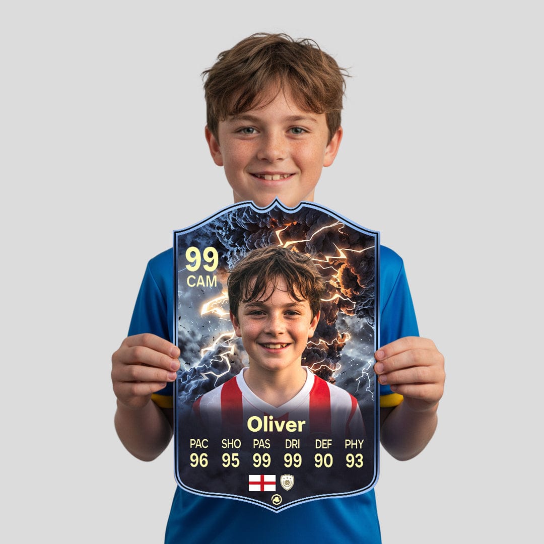 When it comes to personalising your card, the basic steps are to upload a photo and add a name to your card. Then you’ll add details like your player’s position and skill ratings out of 99 for each football skill shown on the card. Our online card builder makes this really easy. And if you aren’t a football card expert, don’t worry!