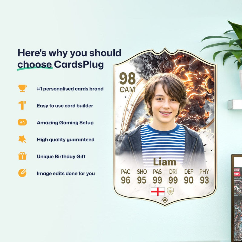 CardsPlug is home to the world’s favourite personalised football cards. Our easy football card builder lets you make a real life football card with your own name, photo, and skill ratings. With 100+ designs to choose from and some inspired by EA SPORTS FC 26 cards seen in EA FC 26, EA FC 25 and FC 24 as well as FIFA cards seen in games like FIFA 23 and FIFA 22.