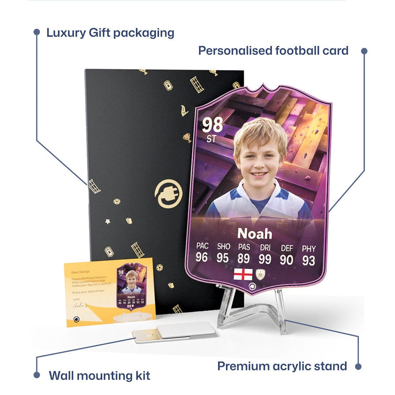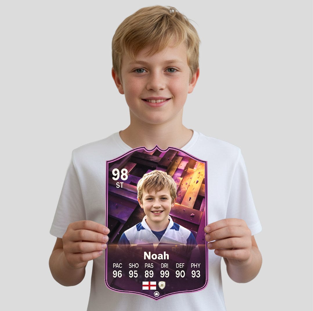When it comes to personalising your card, the basic steps are to upload a photo and add a name to your card. Then you’ll add details like your player’s position and skill ratings out of 99 for each football skill shown on the card. Our online card builder makes this really easy. And if you aren’t a football card expert, don’t worry!