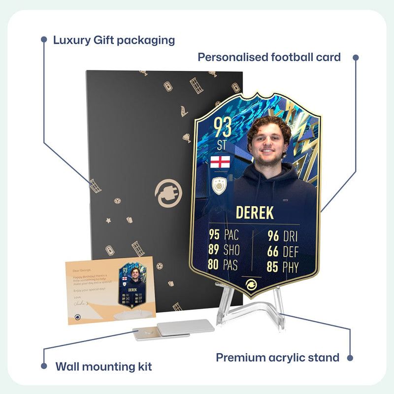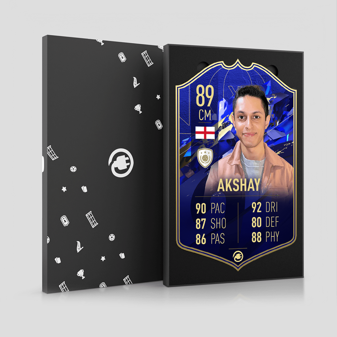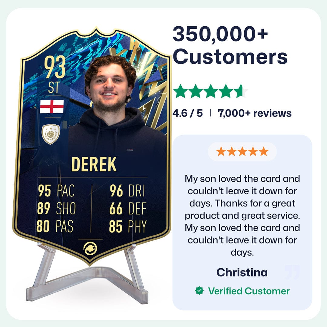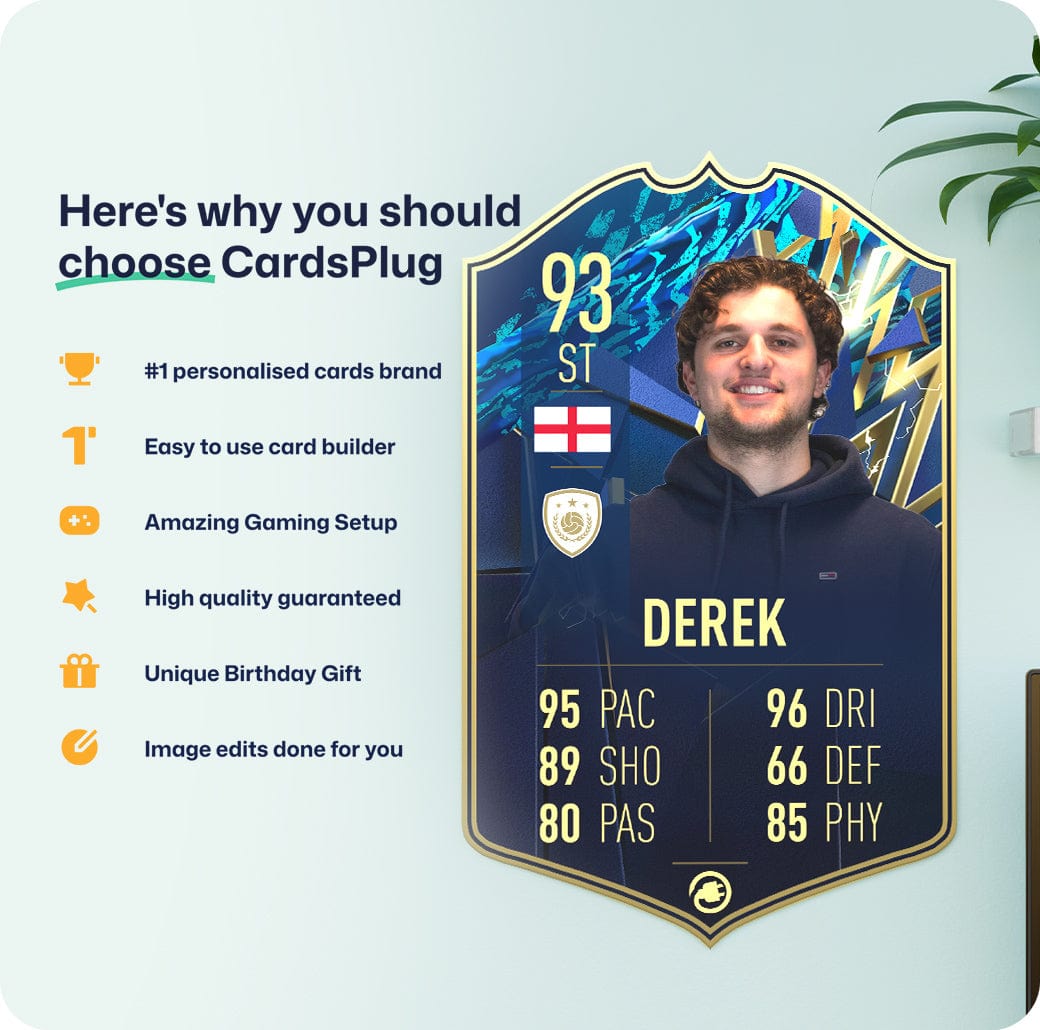 CardsPlug is home to the world’s favourite personalised football cards. Our easy football card builder lets you make a real life football card with your own name, photo, and skill ratings. With 100+ designs to choose from and some inspired by EA SPORTS FC 26 cards seen in EA FC 26, EA FC 25 and FC 24 as well as FIFA cards seen in games like FIFA 23 and FIFA 22.