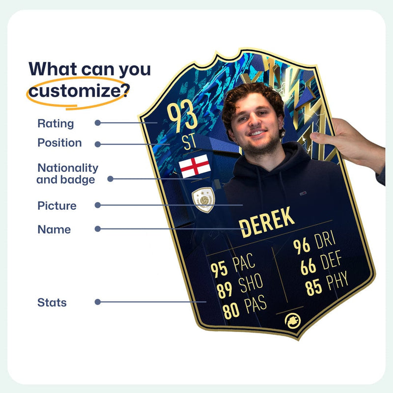 When it comes to personalising your card, the basic steps are to upload a photo and add a name to your card. Then you’ll add details like your player’s position and skill ratings out of 99 for each football skill shown on the card. Our online card builder makes this really easy. And if you aren’t a football card expert, don’t worry!