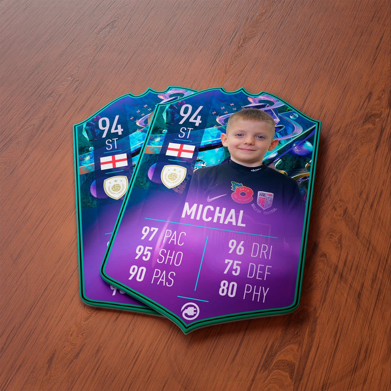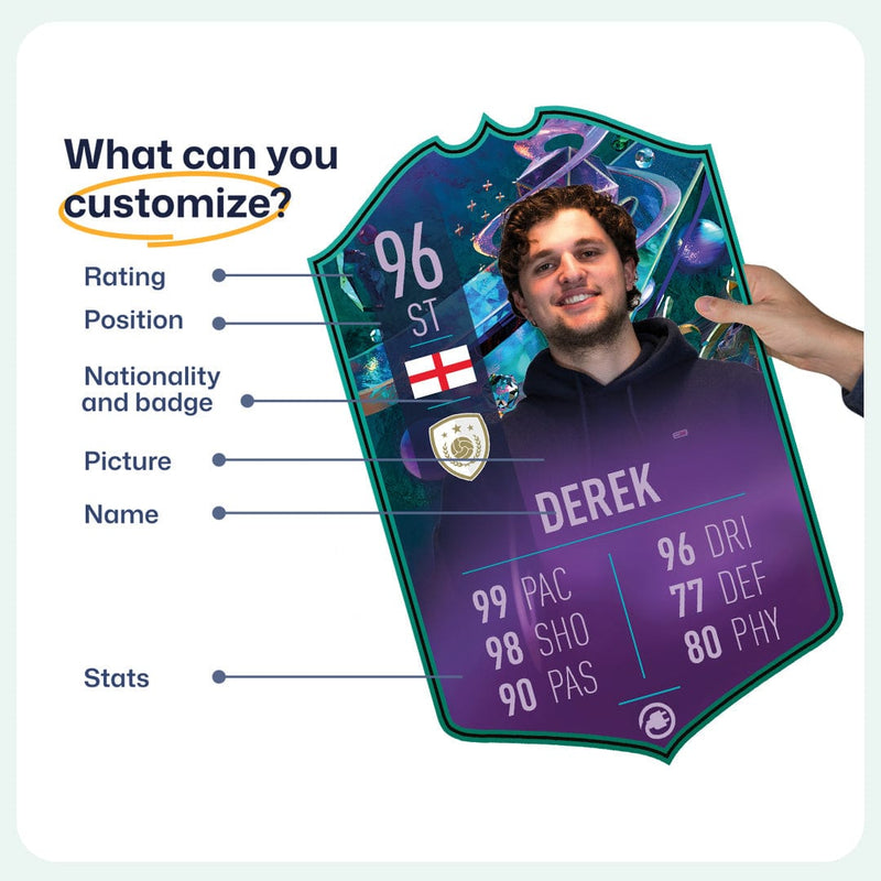 When it comes to personalising your card, the basic steps are to upload a photo and add a name to your card. Then you’ll add details like your player’s position and skill ratings out of 99 for each football skill shown on the card. Our online card builder makes this really easy. And if you aren’t a football card expert, don’t worry!