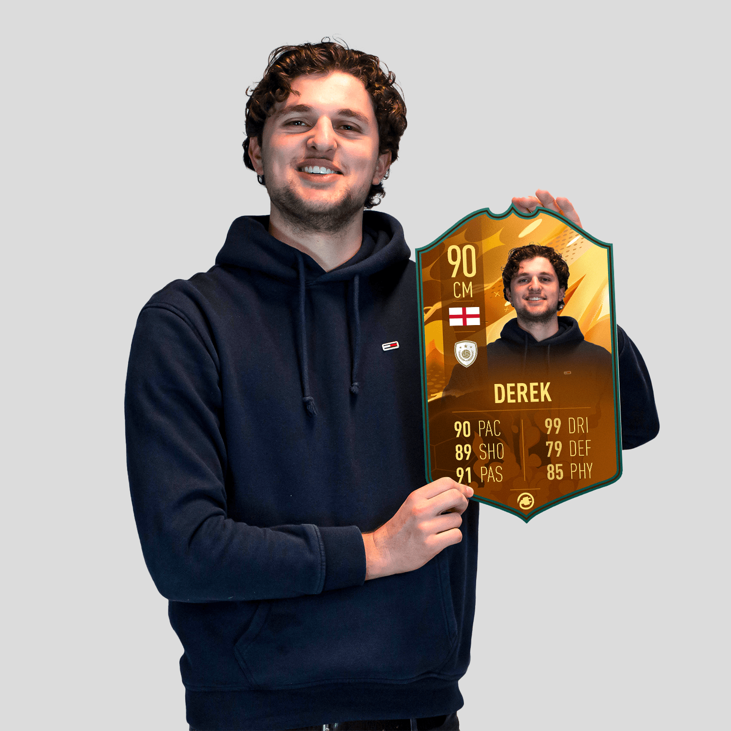 When it comes to personalising your card, the basic steps are to upload a photo and add a name to your card. Then you’ll add details like your player’s position and skill ratings out of 99 for each football skill shown on the card. Our online card builder makes this really easy. And if you aren’t a football card expert, don’t worry!