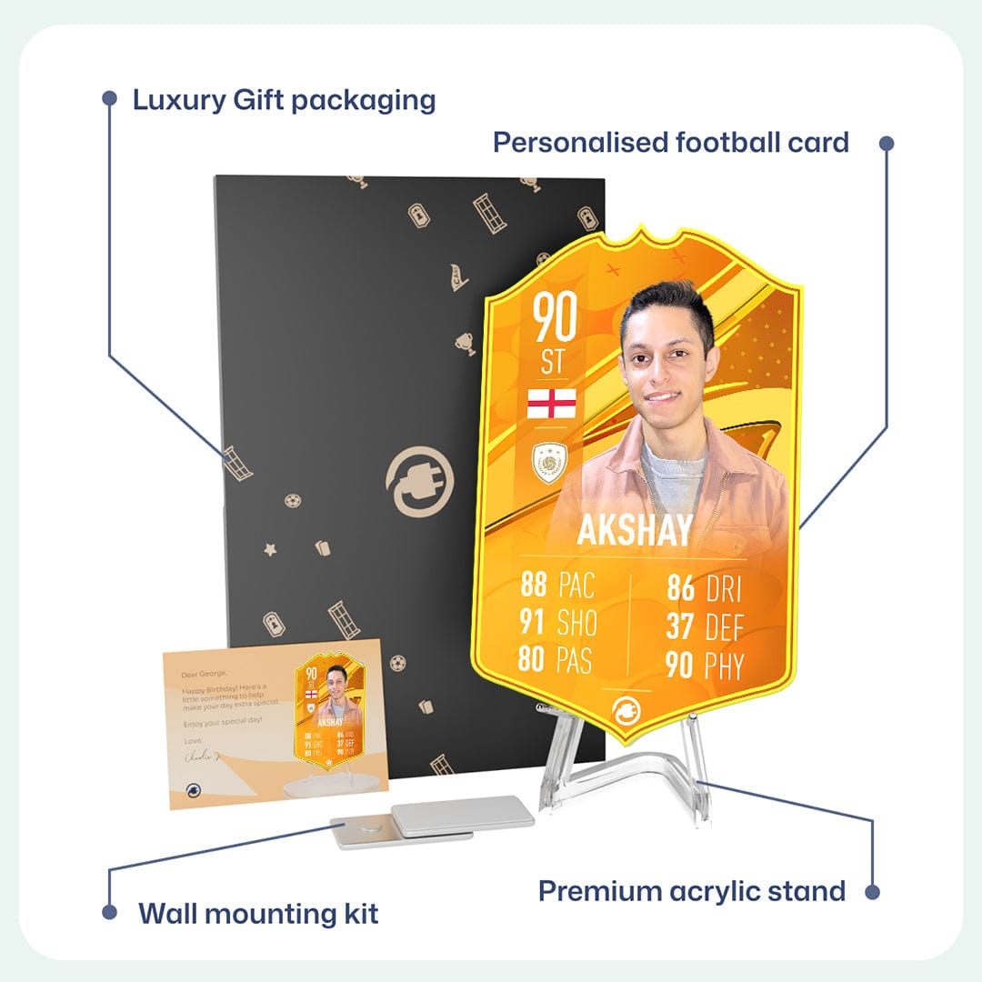 When it comes to personalising your card, the basic steps are to upload a photo and add a name to your card. Then you’ll add details like your player’s position and skill ratings out of 99 for each football skill shown on the card. Our online card builder makes this really easy. And if you aren’t a football card expert, don’t worry!